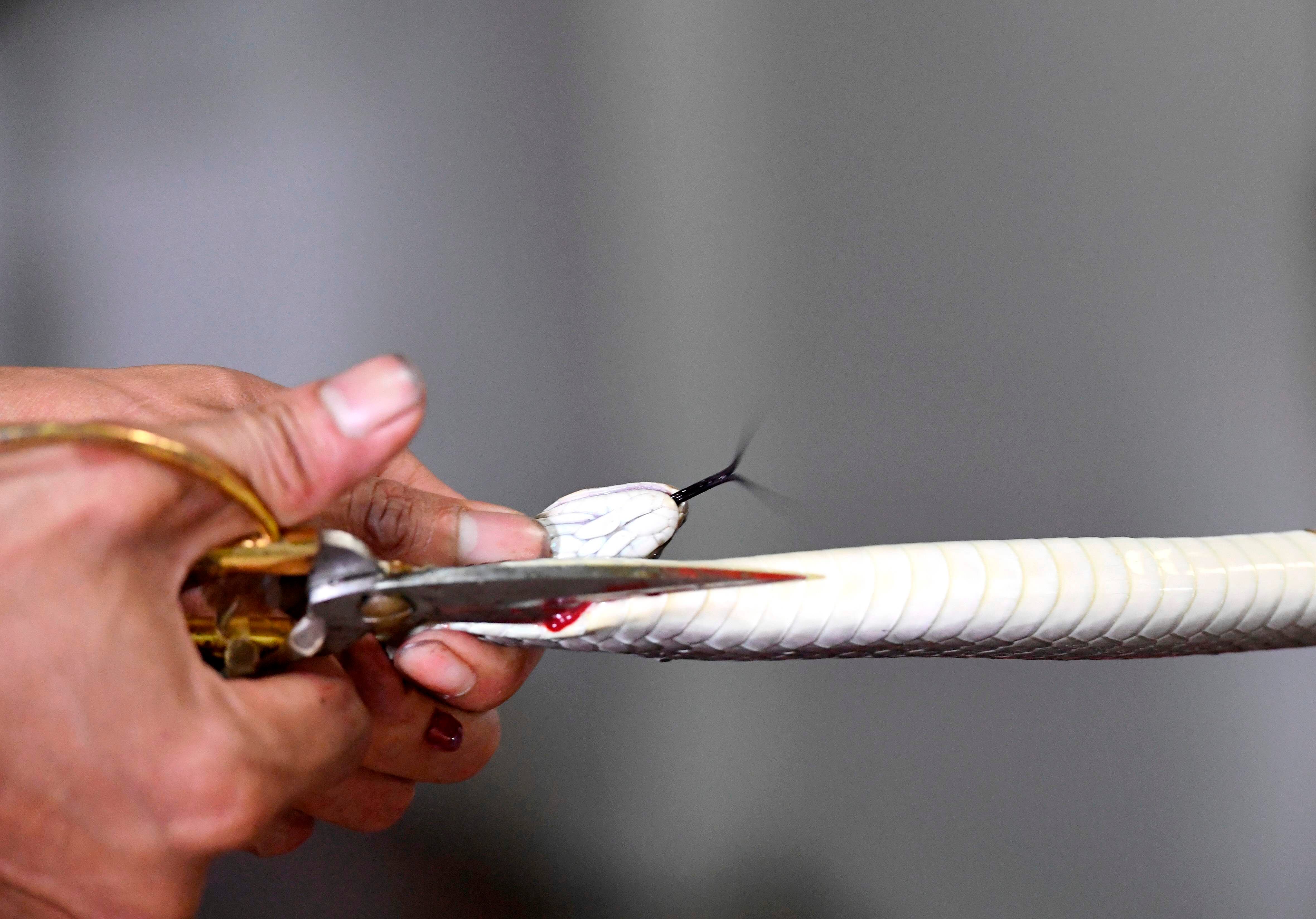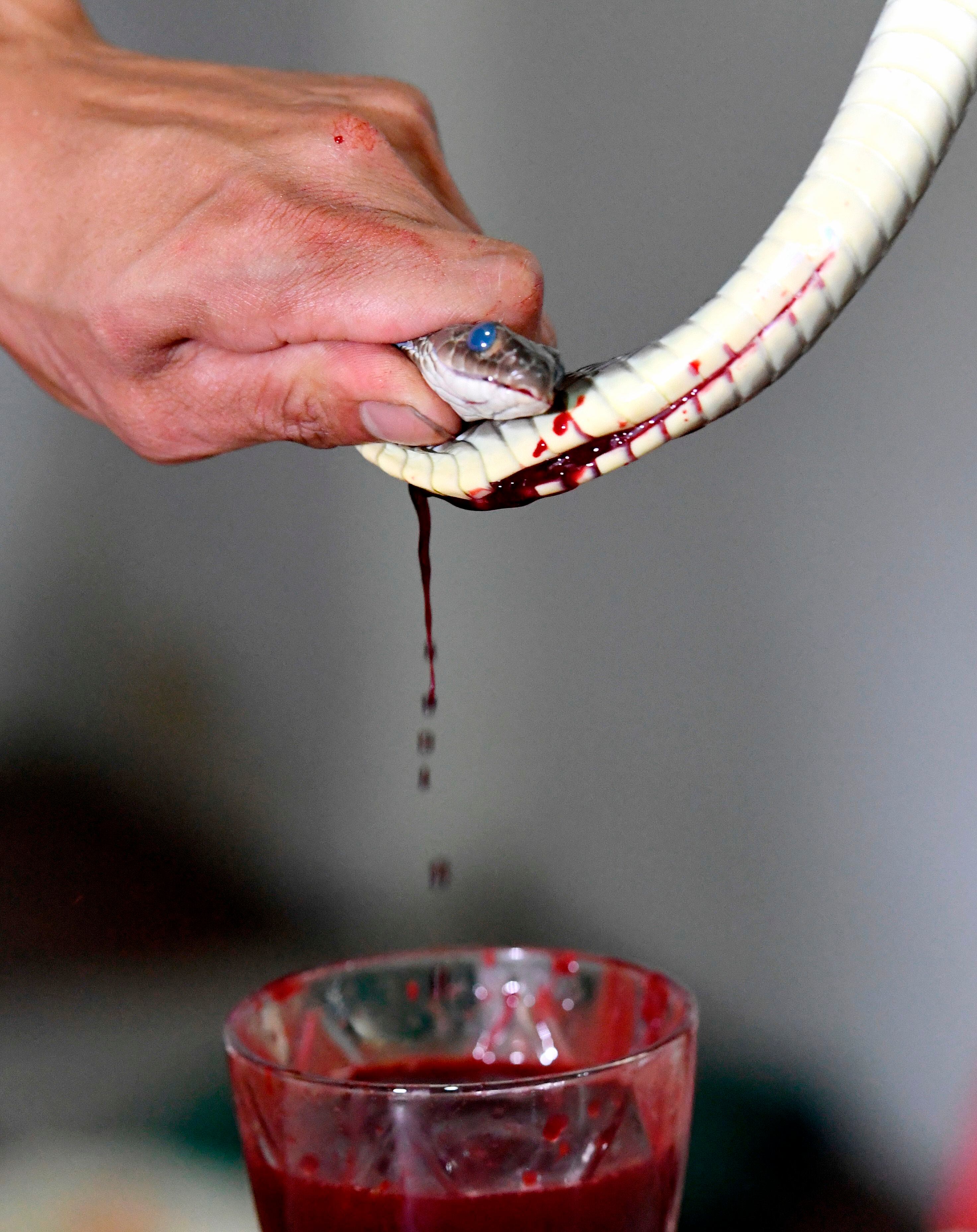 “Al cortar a la serpiente, su sangre debe caer en alcohol muy fuerte para que se mueran las bacterias”, afirma Dinh Tien Dung, un chef especialista de este animal.