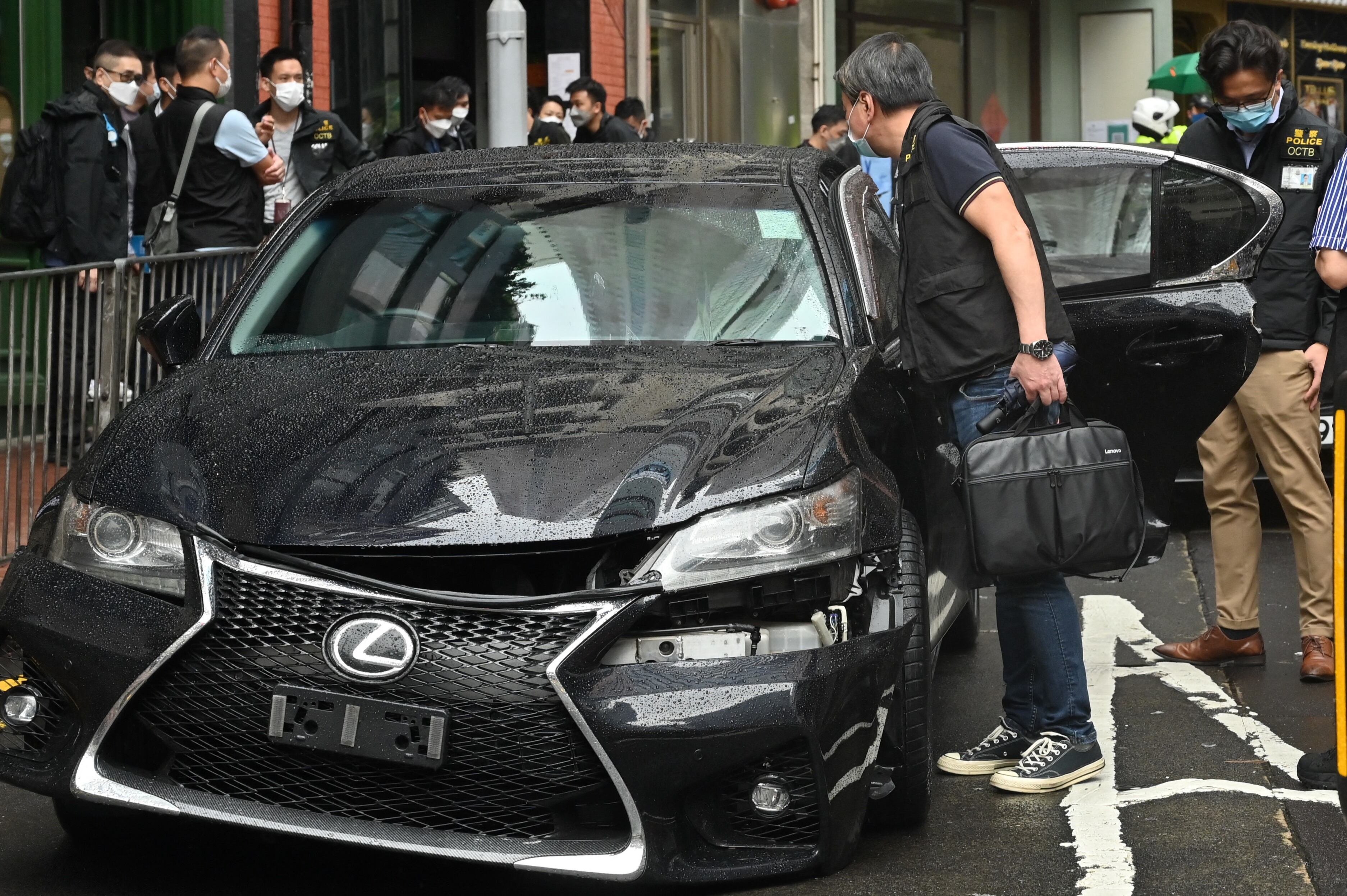 Un tramo de la calle cerca del área de Lan Kwai Fong fue acordonado por agentes de la policía que investigaban un carro Lexus con el frente y el costado chocados.