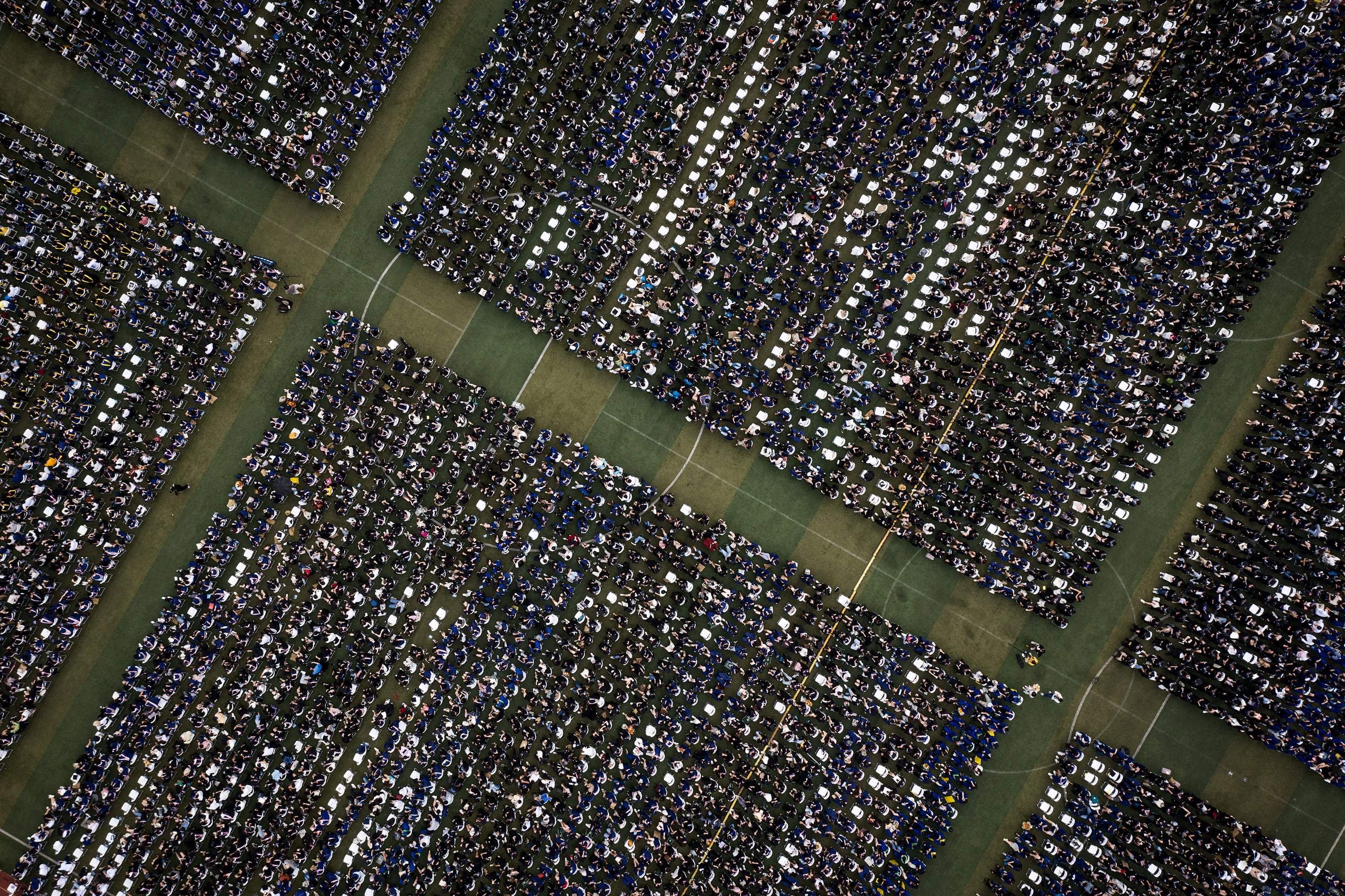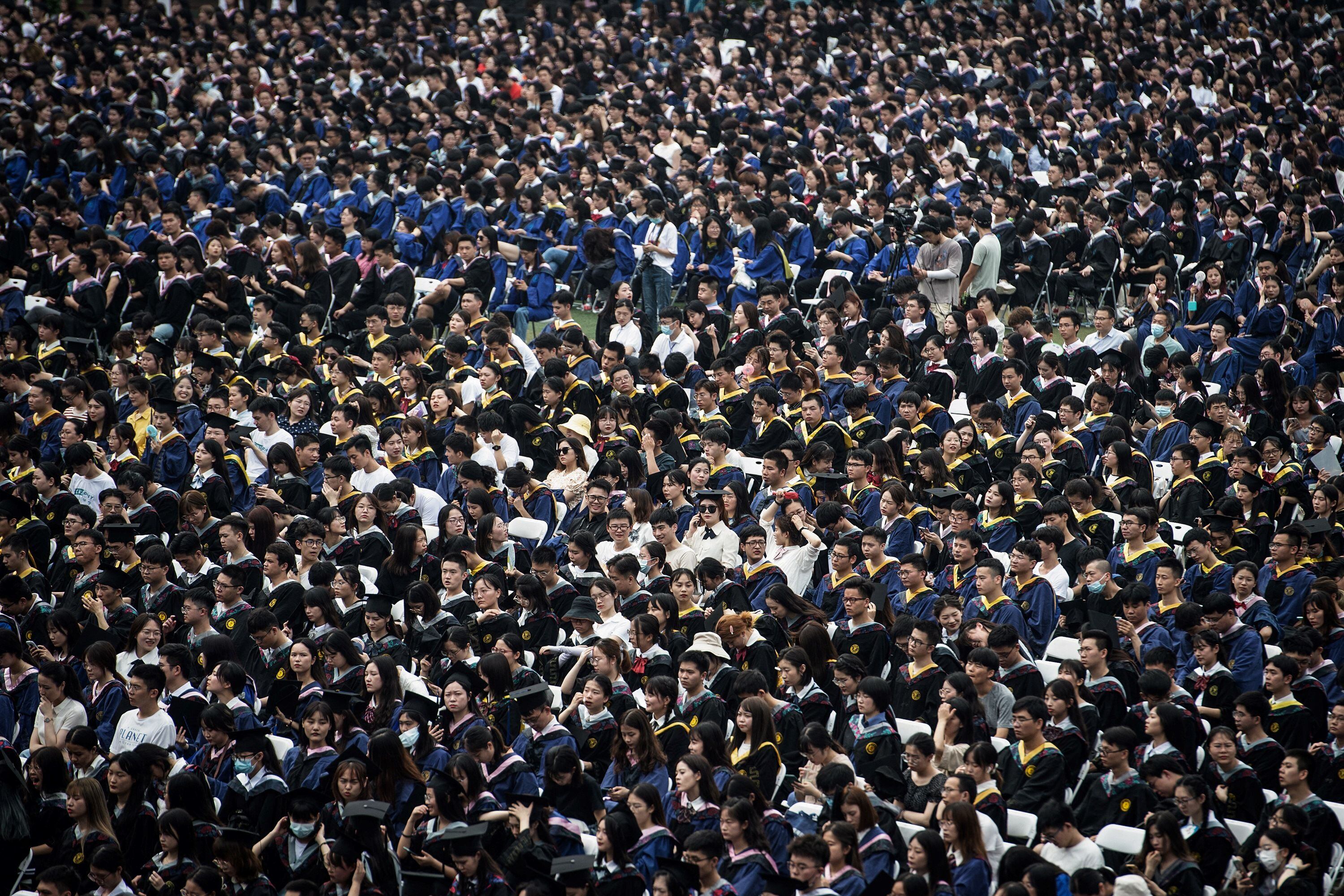 Entre los estudiantes sentados uno junto a otro, más de 2.200 tendrían que haber recibido su diploma el año pasado, pero la ceremonia fue postergada a raíz de la epidemia.