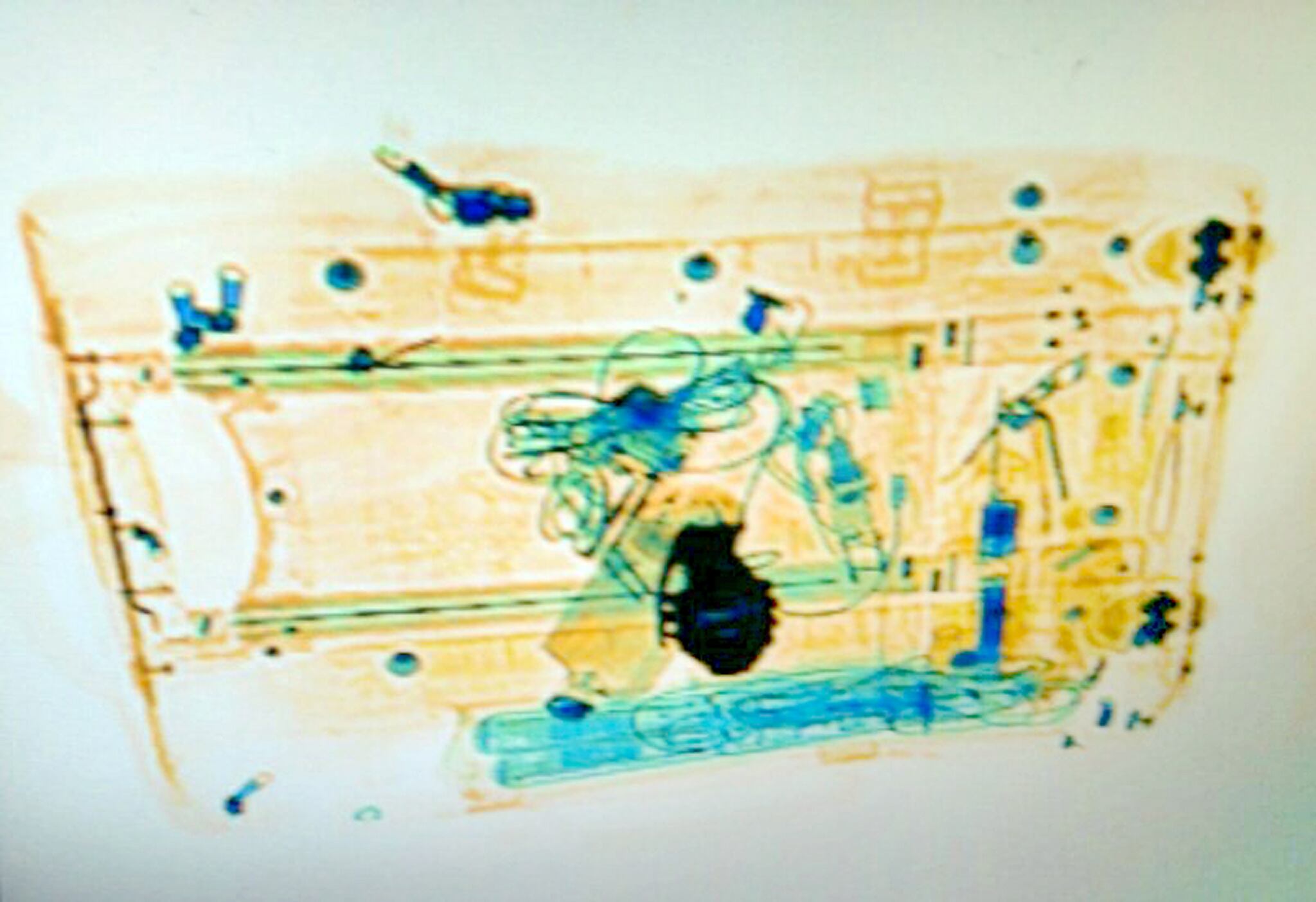Una foto que entregó la policía catalana muestra en la revisión de rayos equis una maleta en la que se ve perfectamente la forma de un objeto igualitico a una granada explosiva de esas que usan en las guerras.