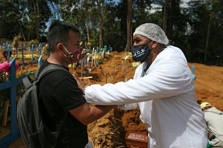 Usando una mascarilla negra con la frase estampada 'SOS Funeral', Izaías consuela a un joven que acaba de sepultar a su padre, víctima del coronavirus. Por normas de la alcaldía, el joven debe hacer la despedida en solitario en el cementerio público.