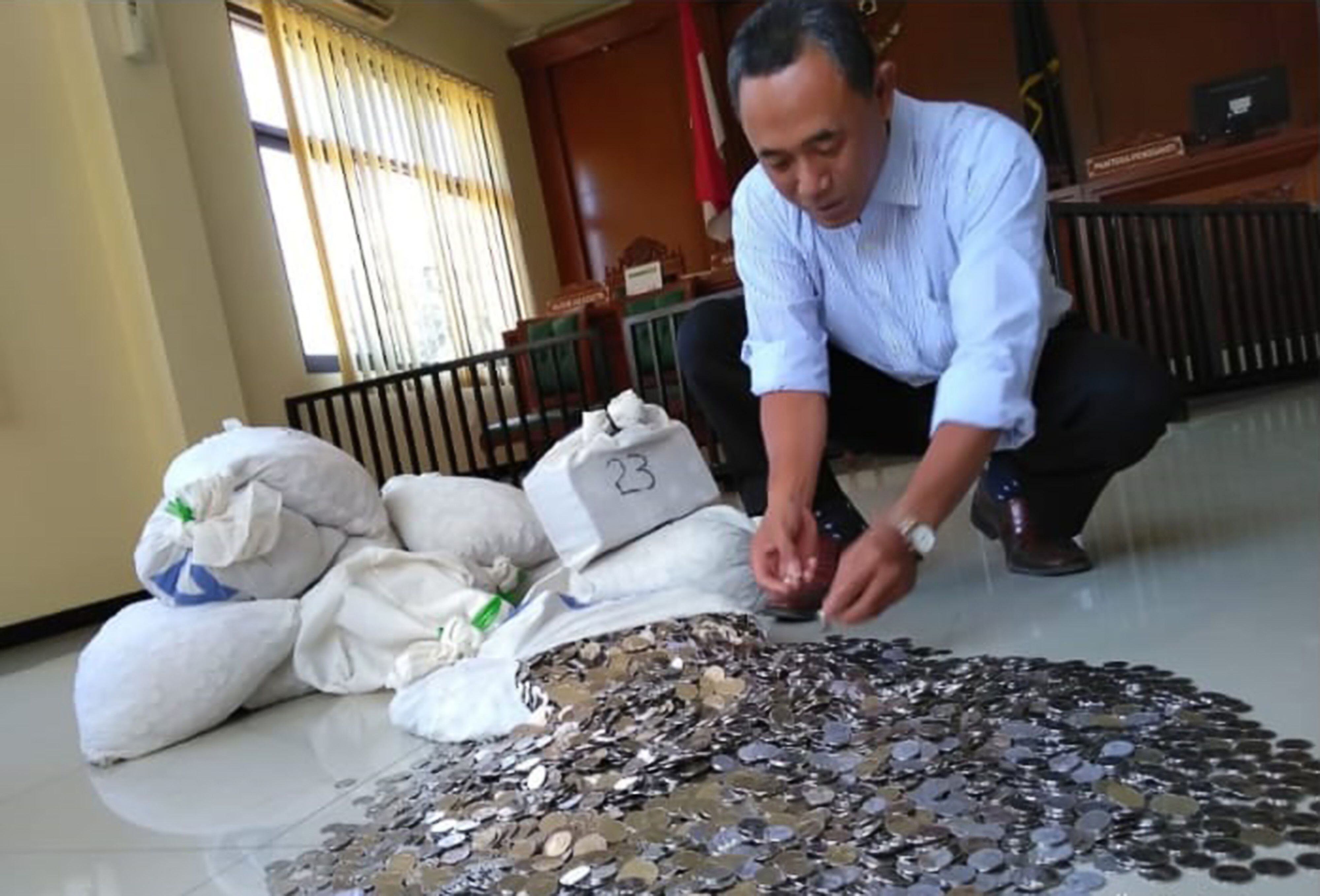 Dwi Susilarto llegó al tribunal en el centro de la isla de Java con una pequeña camioneta con la que transportó casi una tonelada de monedas.
