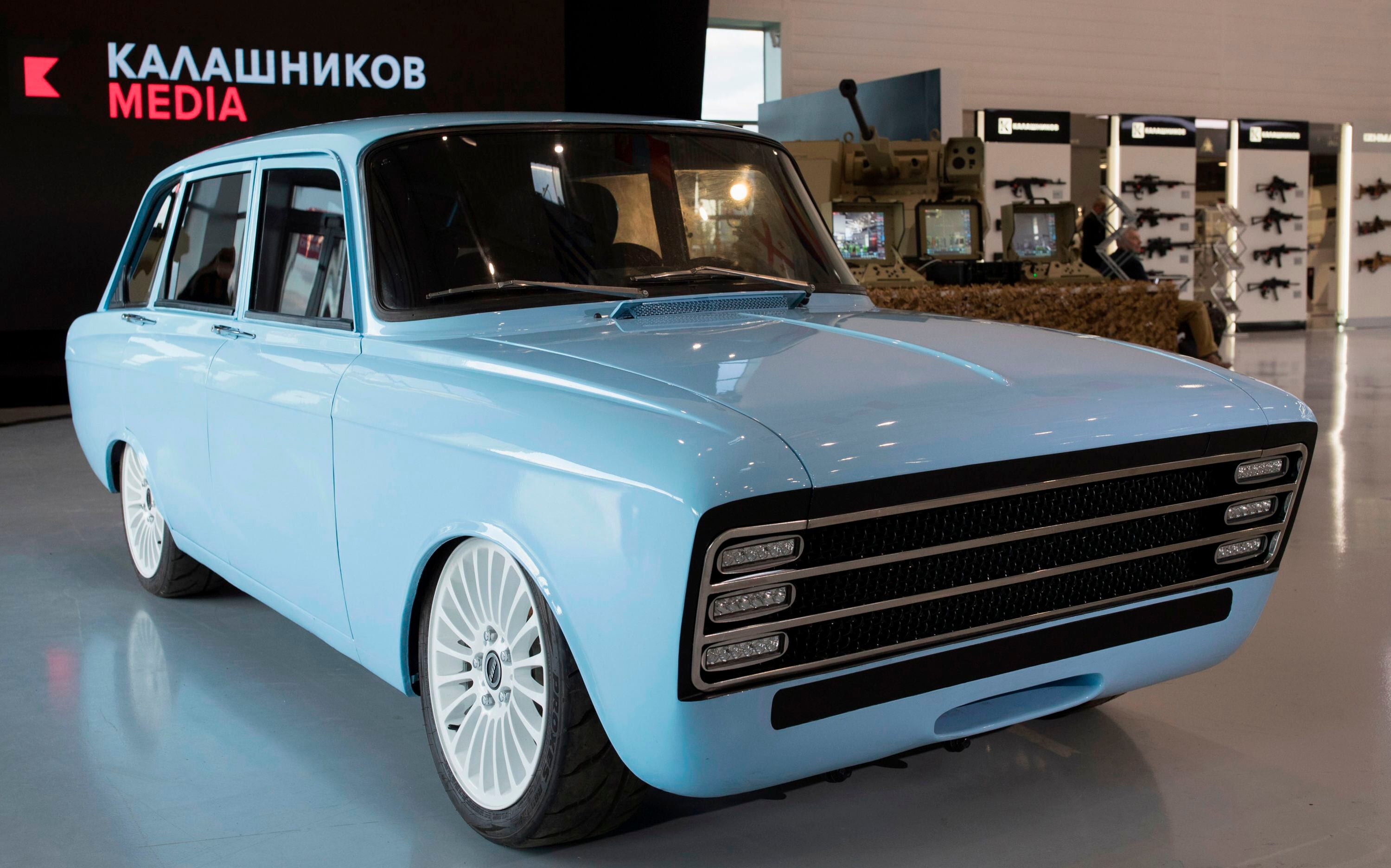 Kalashnikov presentó el prototipo de su nuevo coche eléctrico, color azul claro y diseño retro, llamado "CV-1" e inspirado de un modelo soviético de los años 1970, el "Ij-Kombi", durante un salón militar en la región de Moscú.