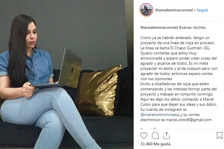 Emma Coronel, la esposa de Joaquín “el Chapo” Guzmán Loera, condenado en febrero en Nueva York por el tráfico de cientos de toneladas de droga a Estados Unidos, anunció este lunes que lanzará una línea de ropa que llevará el nombre de su marido y sus iniciales, JGL.