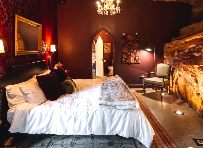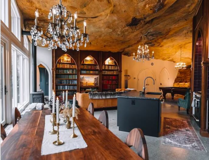 Una vez terminada, la “casa cueva” de 139 metros cuadrados tiene capacidad para seis personas con dos habitaciones, cada una con una cama King y dos camas individuales adicionales en una de las habitaciones. Cuenta con una cocina completa, una mesa de billar, acceso a las rutas de senderismo privadas de Dunlap Hollow, una bañera de hidromasaje y un increíble espacio de patio.