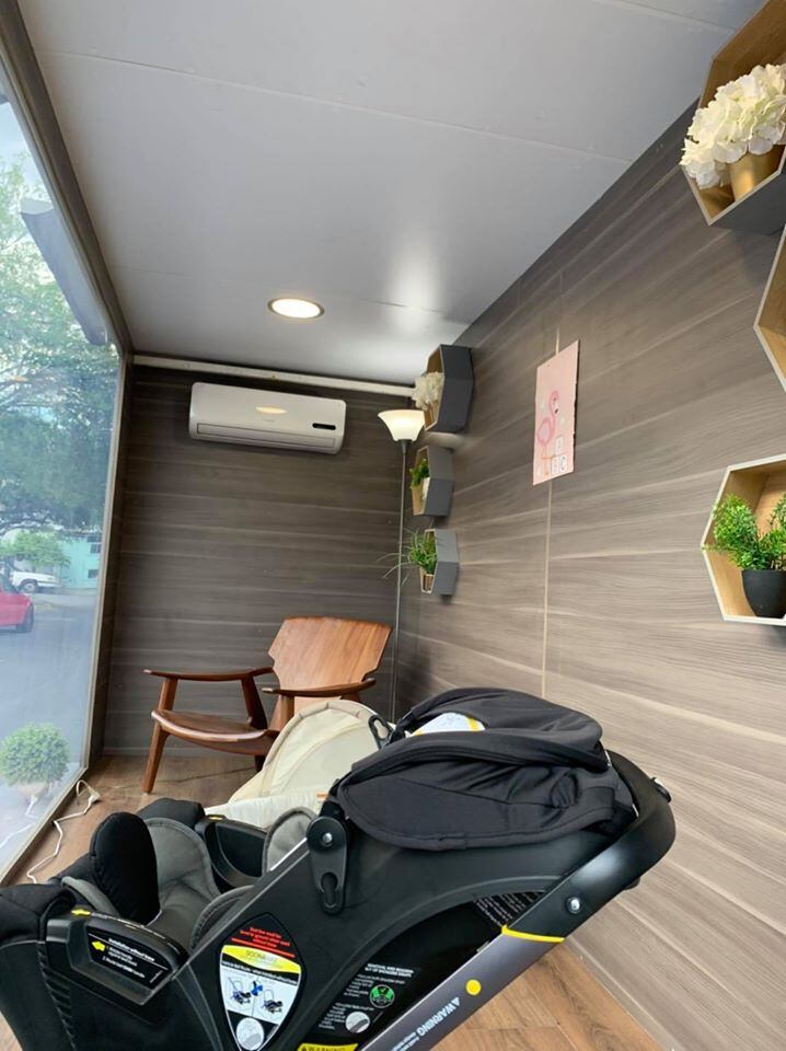 Un sillón, plantas e imágenes de cuentos infantiles adornan la cabina del vehículo que se estaciona frente a la casa del bebé. Los padres presentan al niño a abuelos y demás familiares desde el cubículo para prevenir contagios.