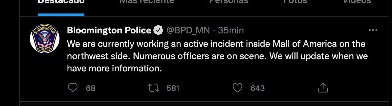 La policía de Bloomington, Minnesota, ha informado que está manejando un “incidente activo” en el Mall of America, el centro comercial más grande de Estados Unidos.