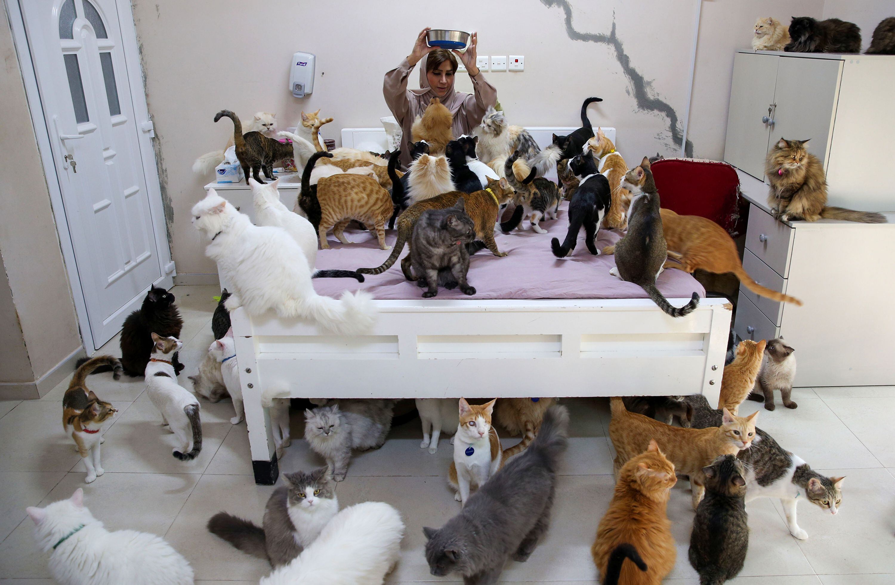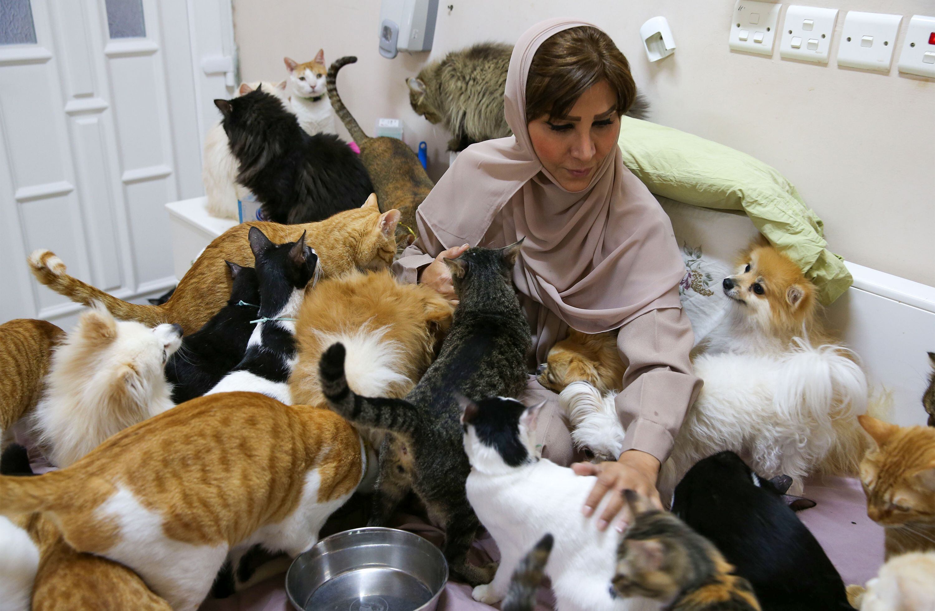 Una docena de gatos y perros se disputan la atención de Maryam al Balushi que distribuye golosinas sobre una cama en su casa de Mascate, la capital de Omán.