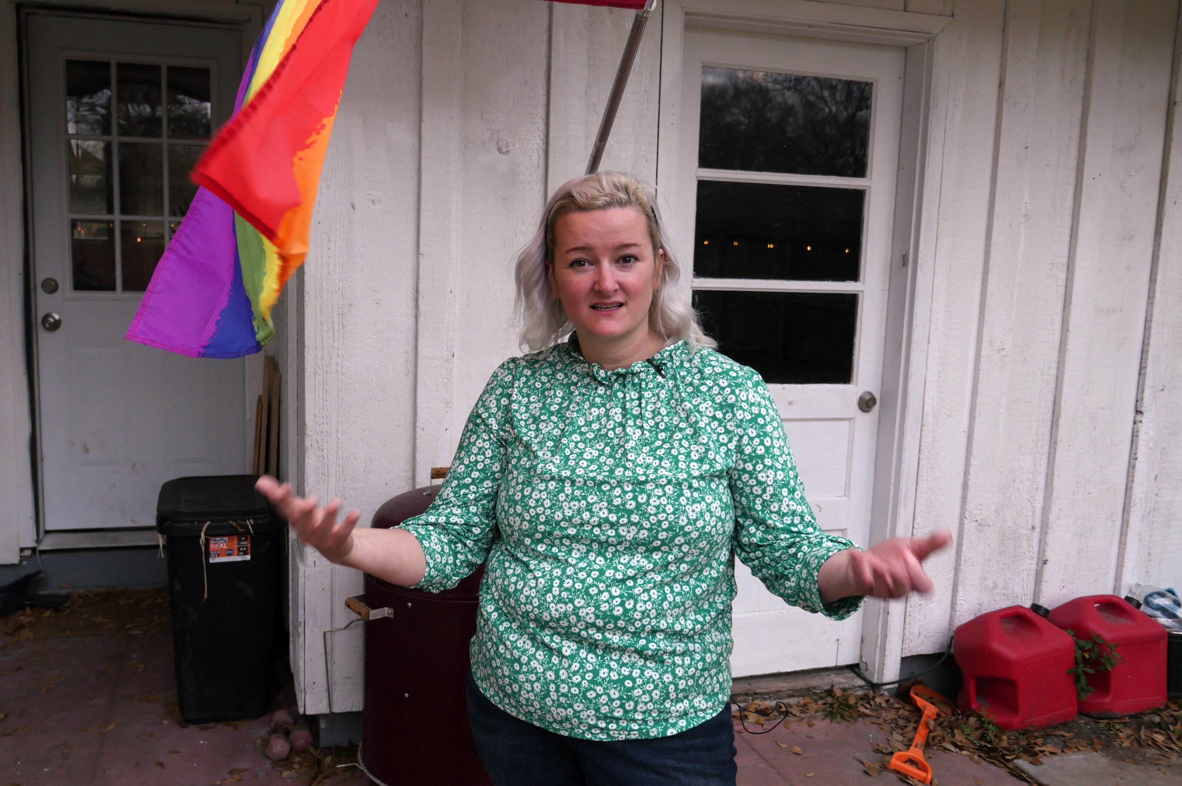 En su jardín, frente a una bandera mitad estadounidense y mitad arcoíris, Rebekah Bryant manifiesta su enojo por la decisión del estado de Texas de declarar ilegales los tratamientos hormonales que ella --Rebekah-- planea recetar a su hija transgénero de 8 años cuando llegue a la adolescencia.