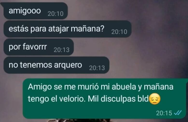 Pero entonces, el amigo, que no se resigna a quedarse sin arquero, y hace un último e increíble intento: “El partido es a las 19 ¿Hay posibilidad de que llegues?”.
