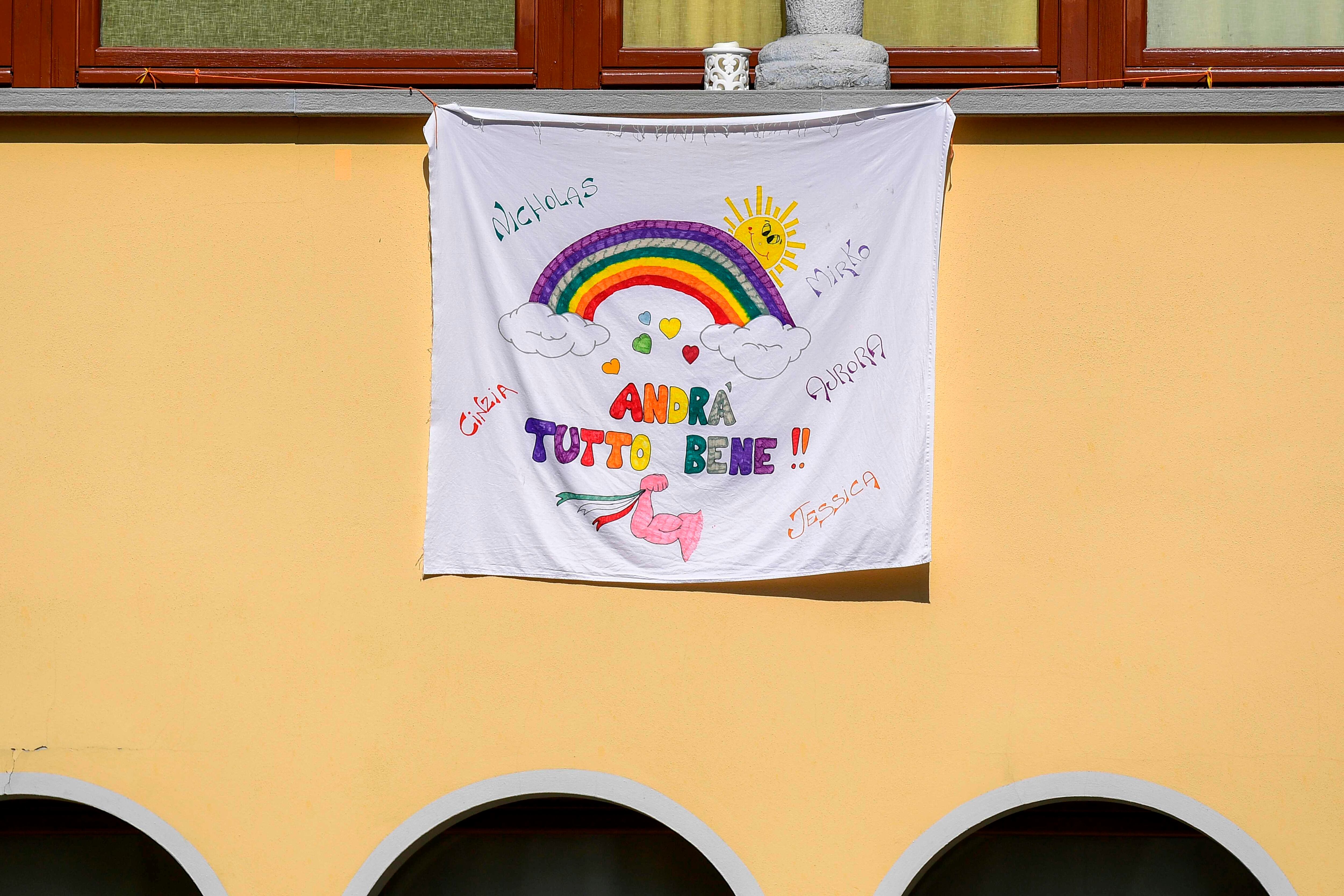 Detrás de él, las banderas italianas ondean en los balcones, al lado de sábanas y carteles decorados con los colores del arcoiris por niños.
