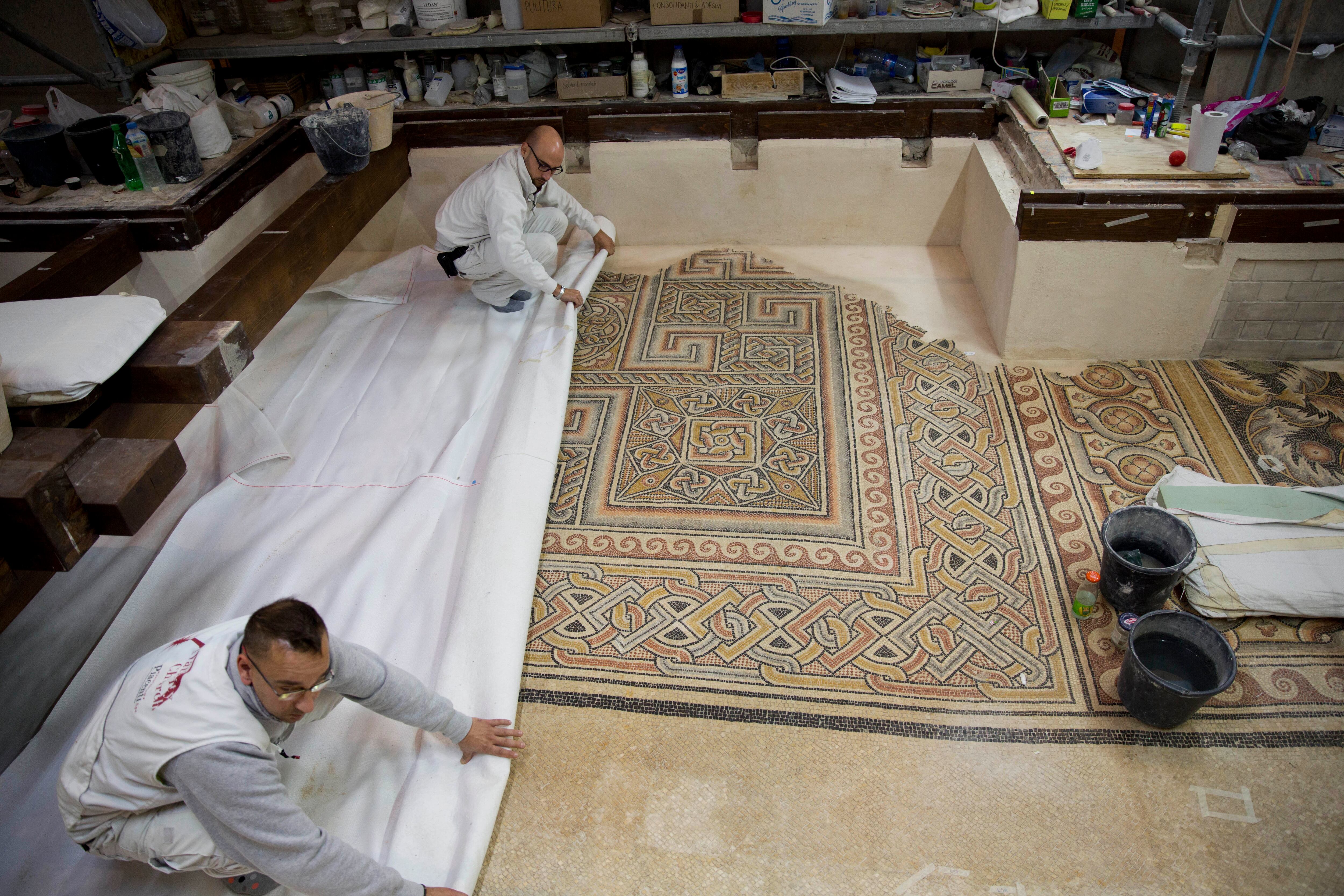 Es un proceso minucioso y lento. Mientras Nassar hablaba, tres trabajadores italianos limpiaban un mosaico con cepillos diminutos y los cubrían con un material protector.