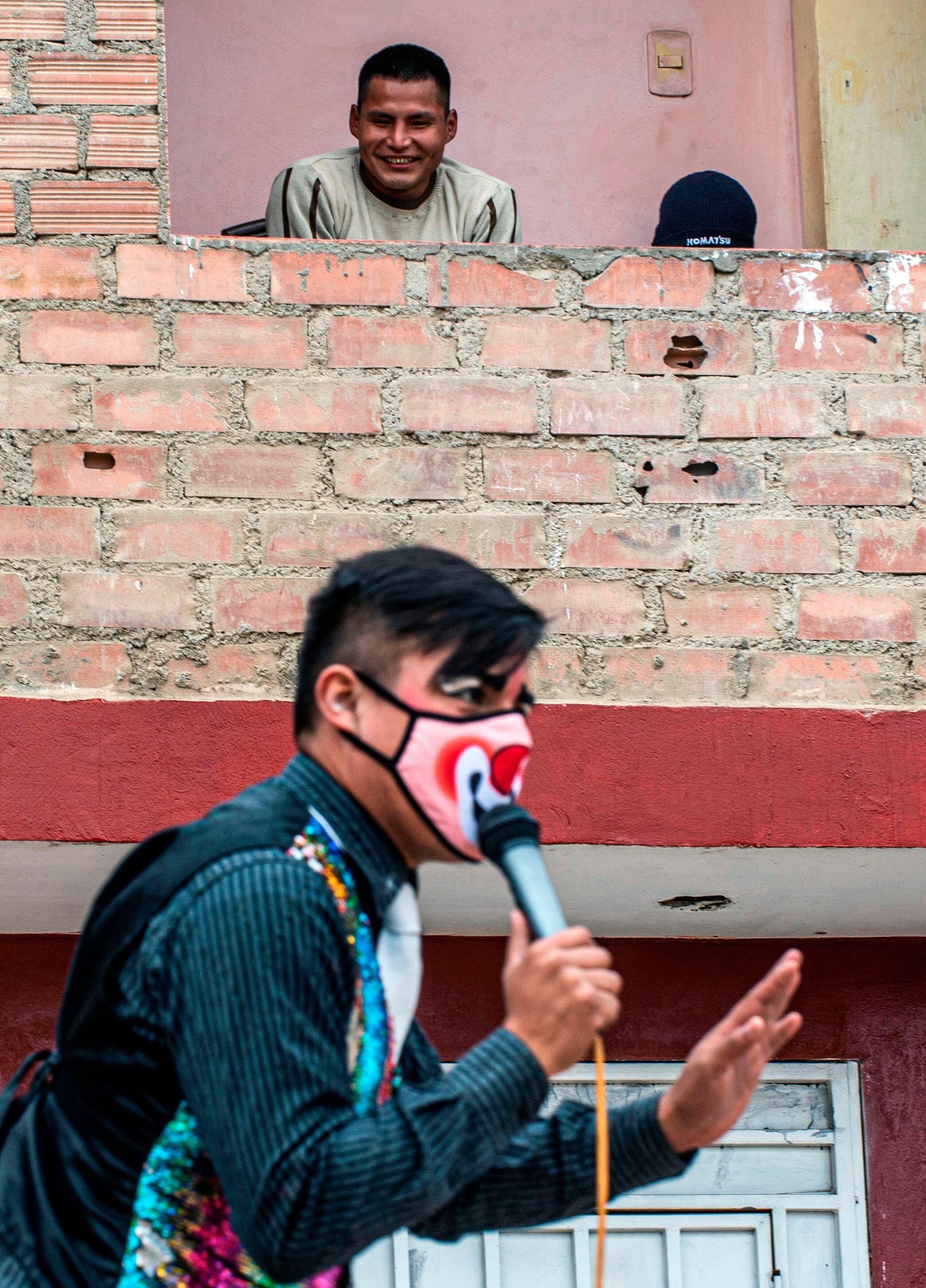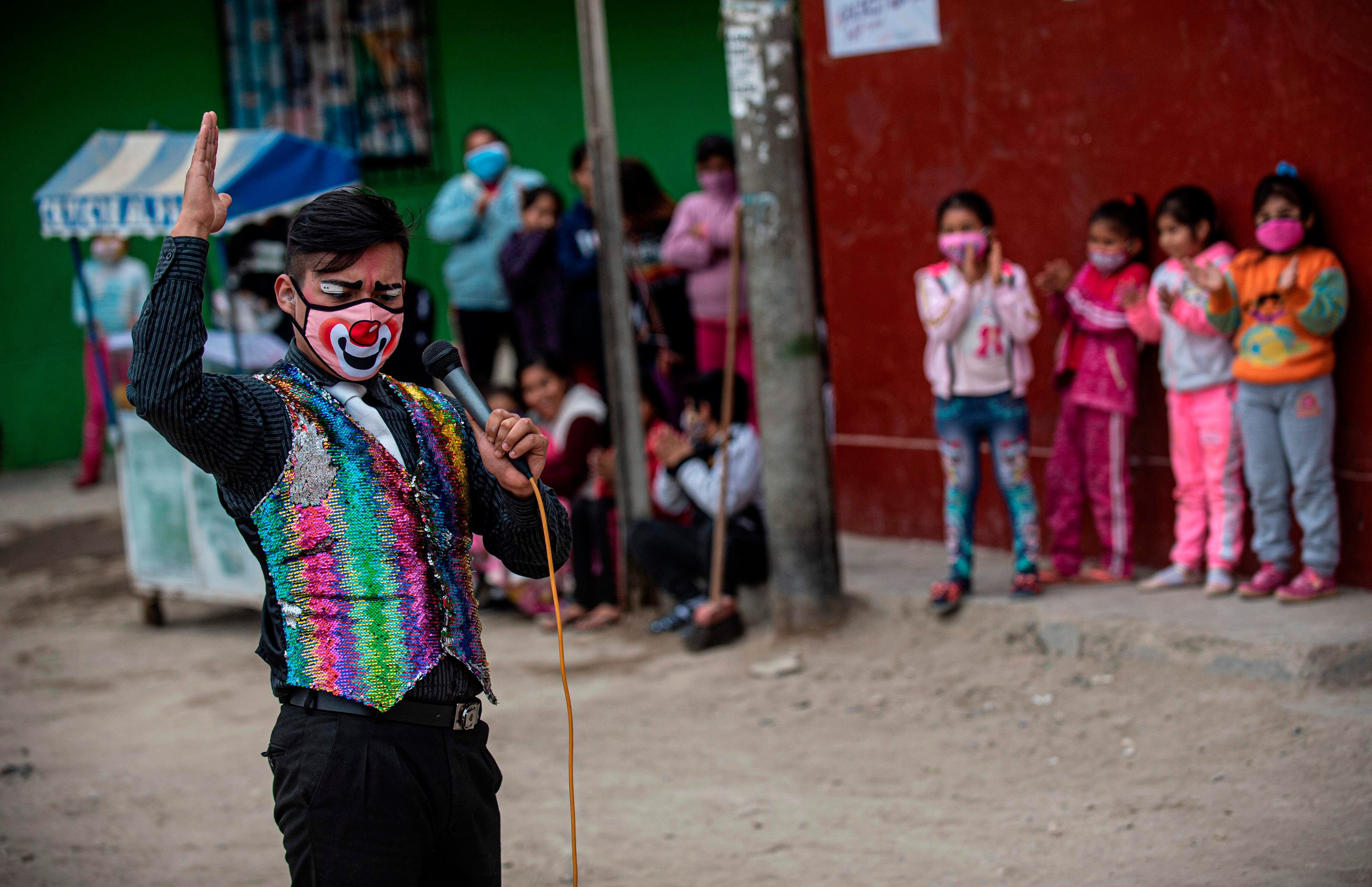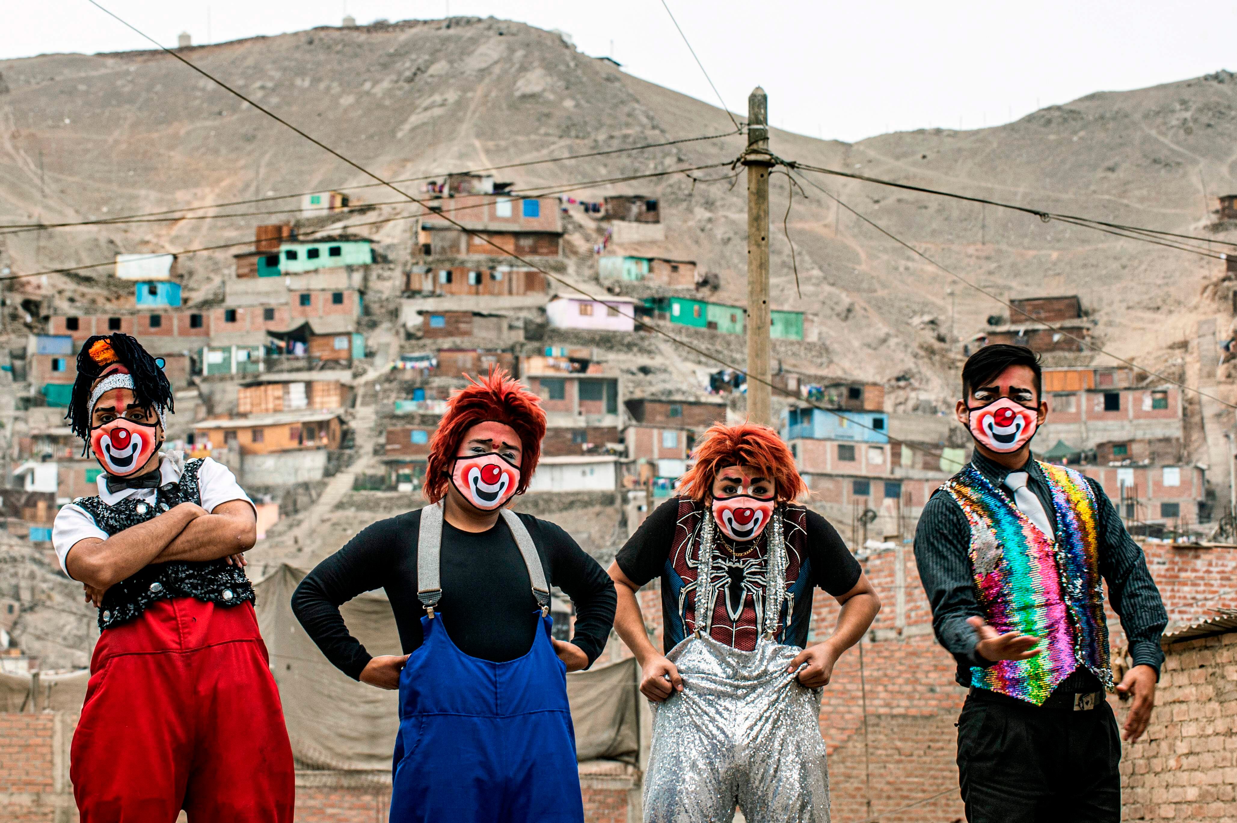 Con narices rojas, coloridas pelucas y también mascarillas con una sonrisa dibujada, los cuatro payasos ofrecen su espectáculo en las polvorientas calles de barriadas del humilde sector norte de Lima. Y el público les sigue desde las ventanas o las puertas de sus casas.
