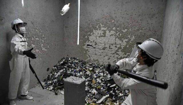 La llamada “sala de fragmentación”, con gruesas paredes de hormigón, permite al que quiera, tras el pago de una entrada, ponerse una bata blanca, un casco, guantes y zapatos de protección para destrozar platos, vasos o impresoras con un bate de béisbol.