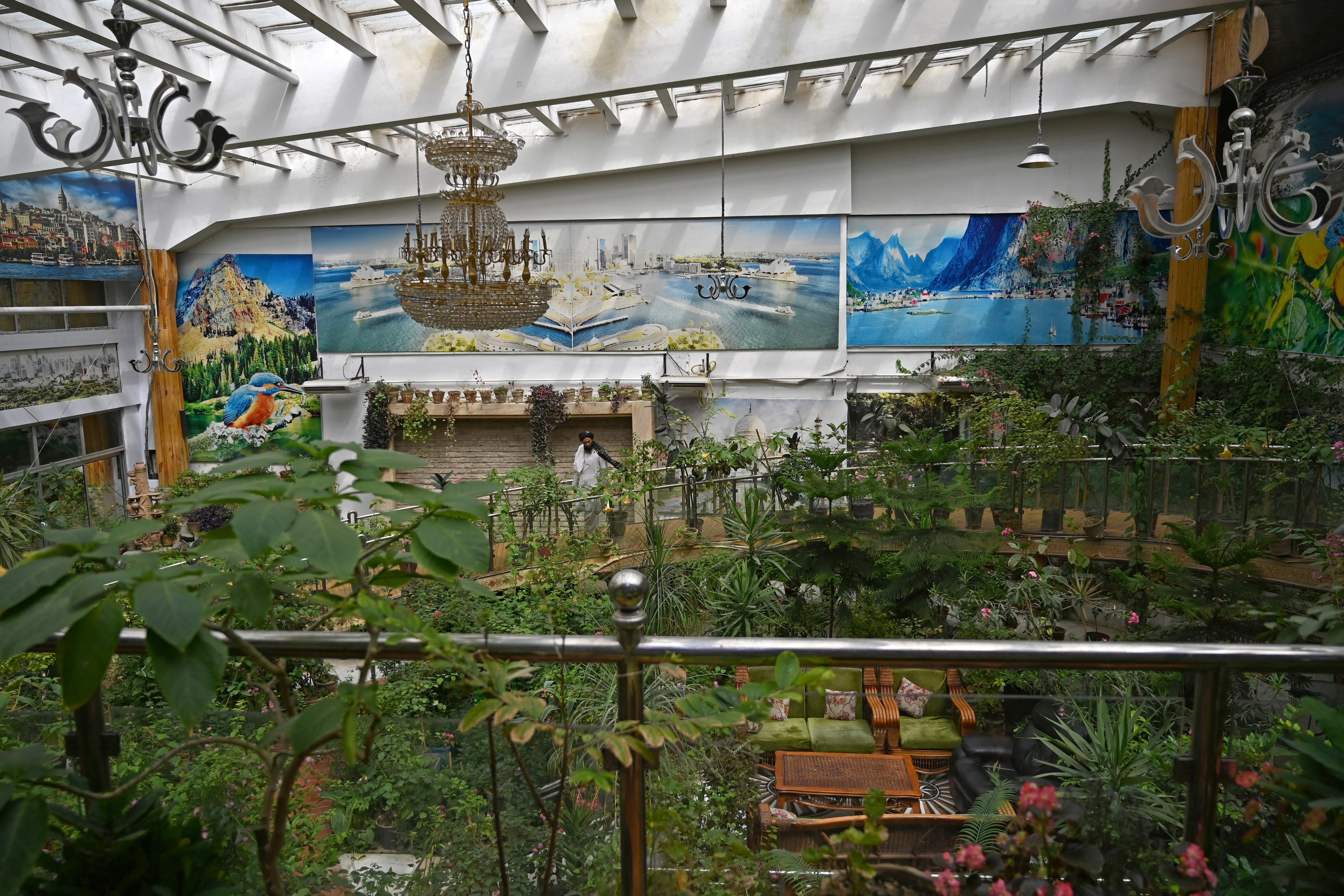 Hace mucho más calor en el enorme invernadero tropical instalado en un ala del edificio, donde los talibanes se pasean o toman el té bajo un techo de cristal de centenares de metros cuadrados.