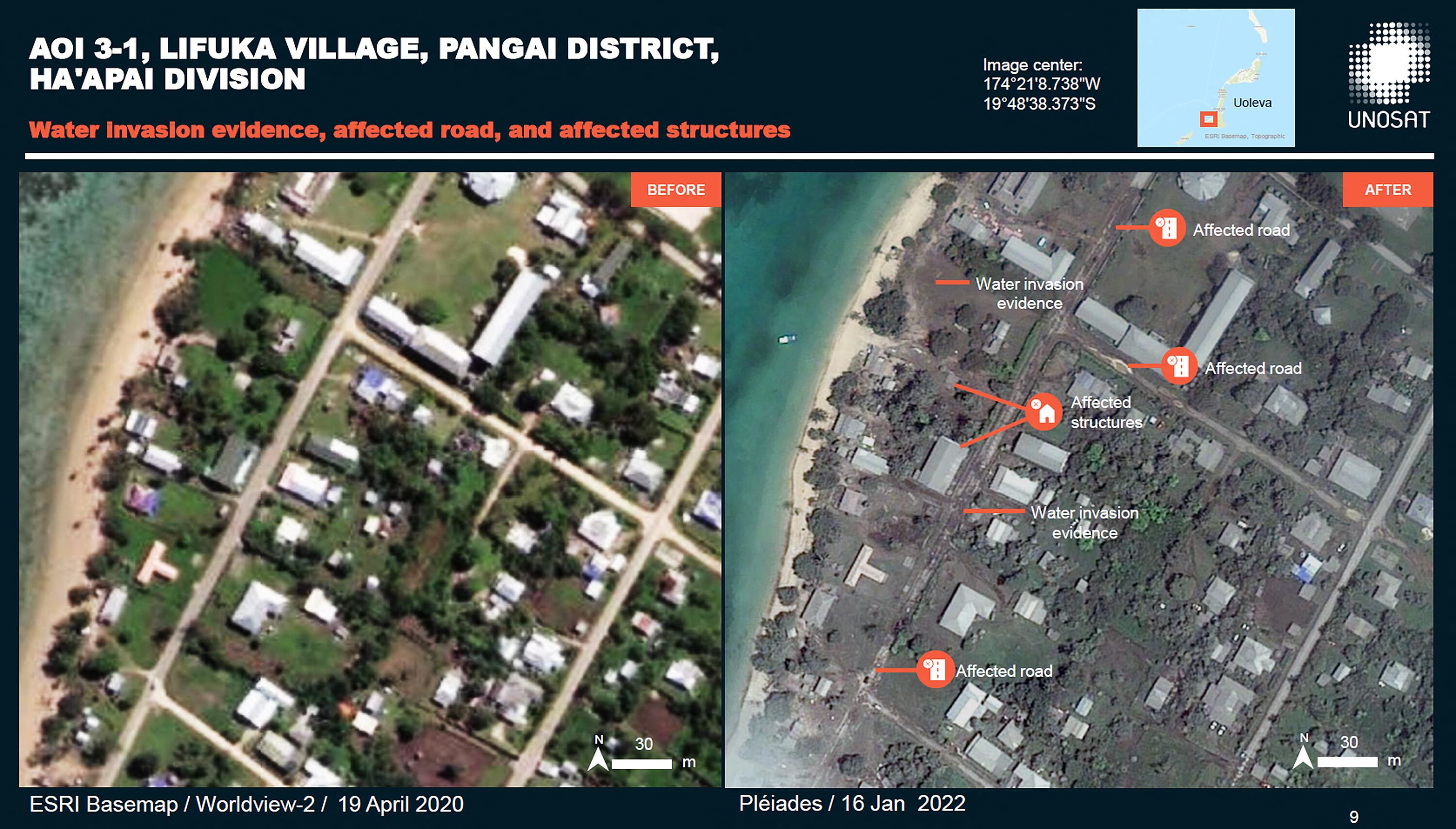 Imágenes divulgadas por el Centro de Satélites de la ONU mostraron el impacto de la erupción y el tsunami en la pequeña isla de Nomuka, una de las más cercanas al volcán Hunga-Tonga-Hunga-Ha’apai.