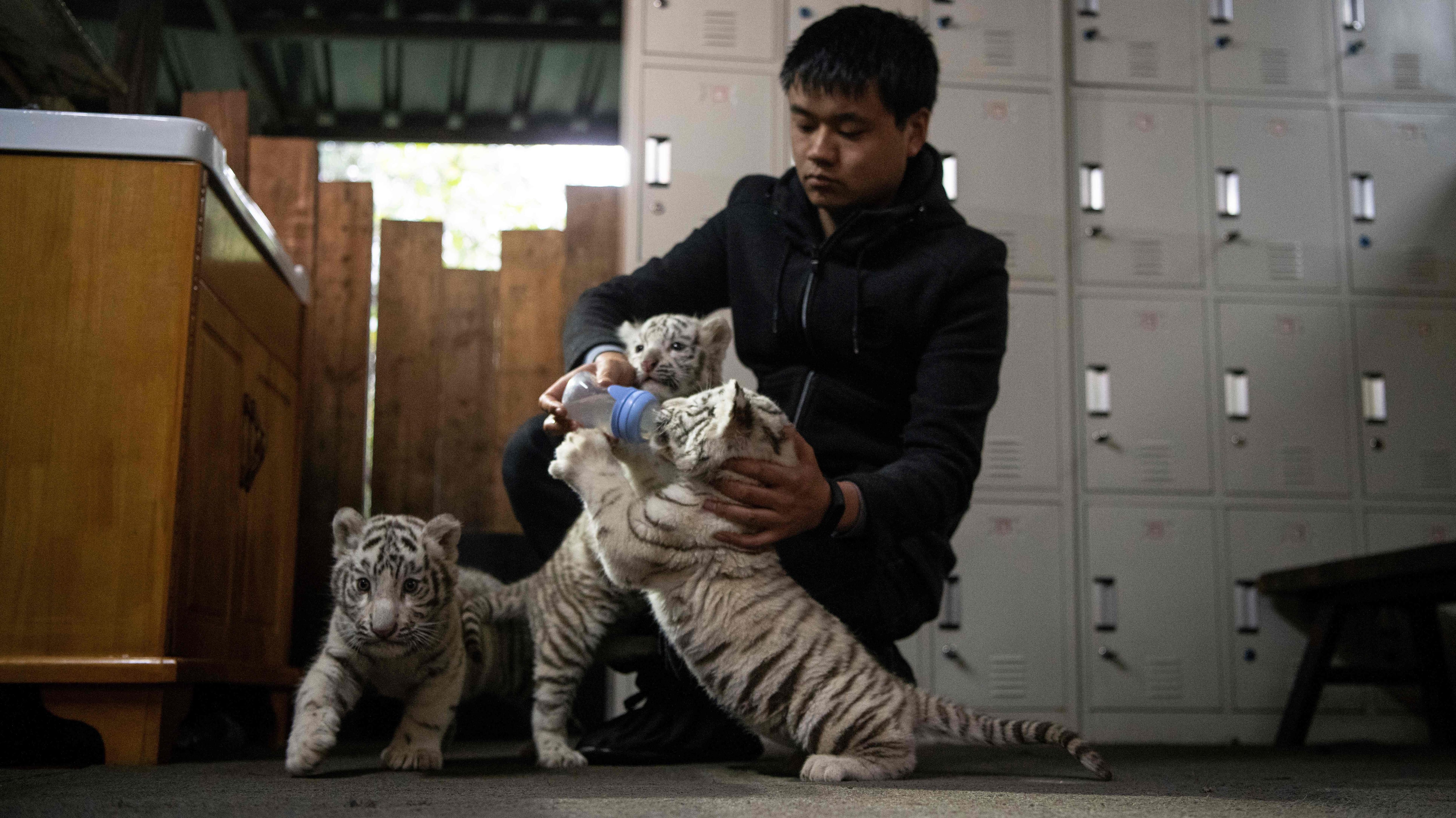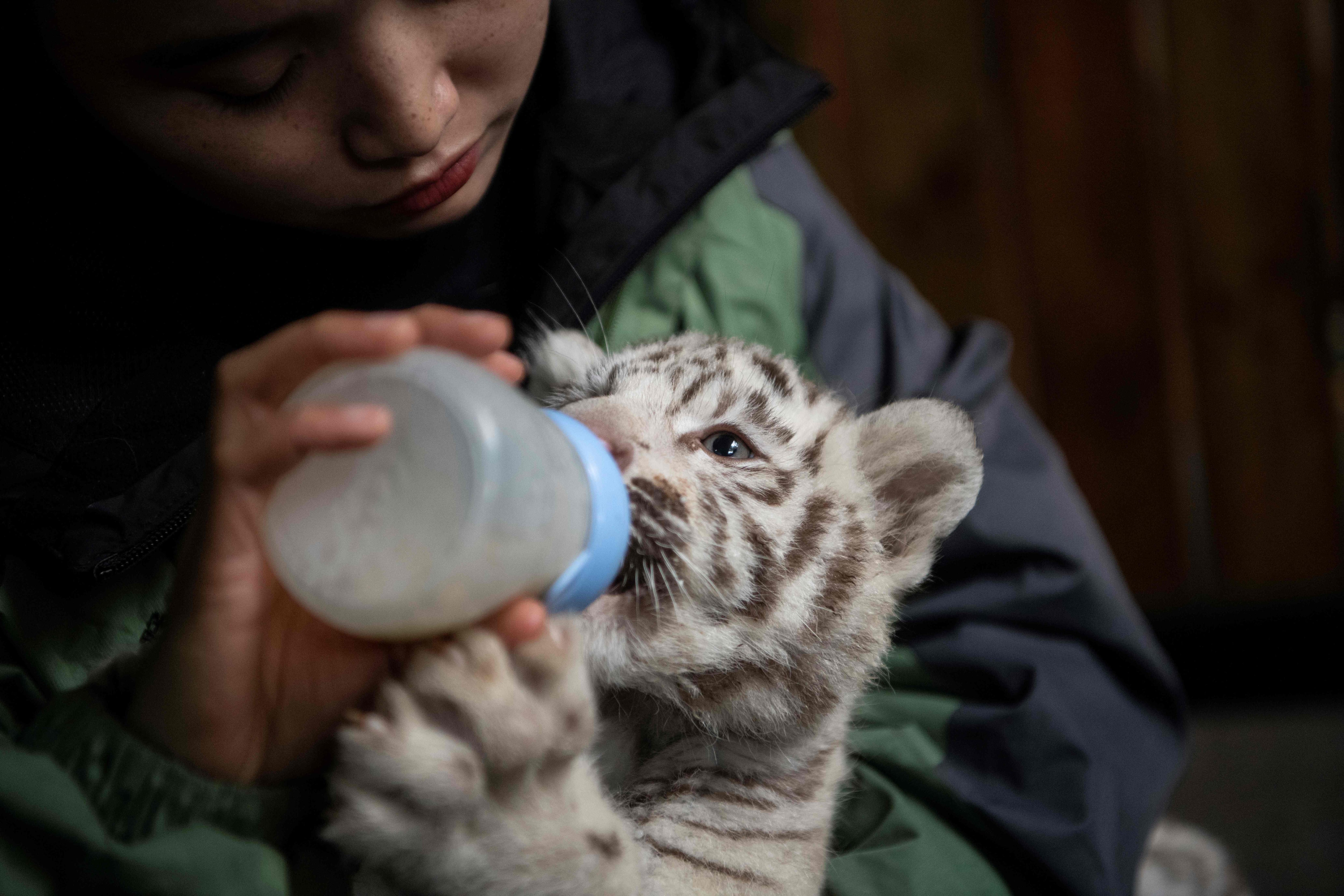 Tres traviesos cachorros de tigre blanco, que devoran sus biberones como cualquier bebé humano, han enamorado a China desde su primera aparición en público.