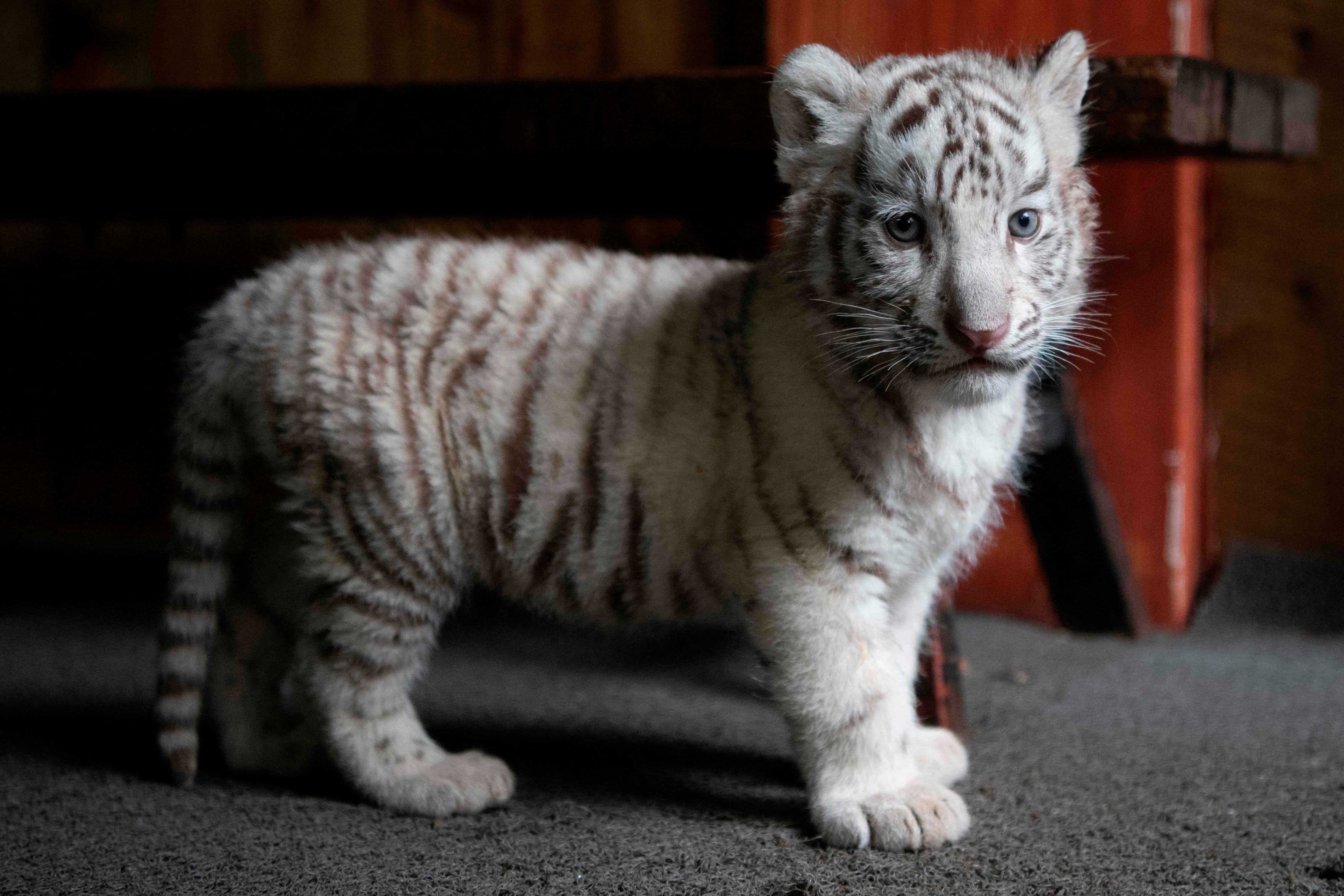 Nacidos hace tres meses en un zoo de Kunming (provincia de Yunnan, sur), los trillizos de ojos azules son ejemplares excepcionales de tigre blanco con rayas negras.