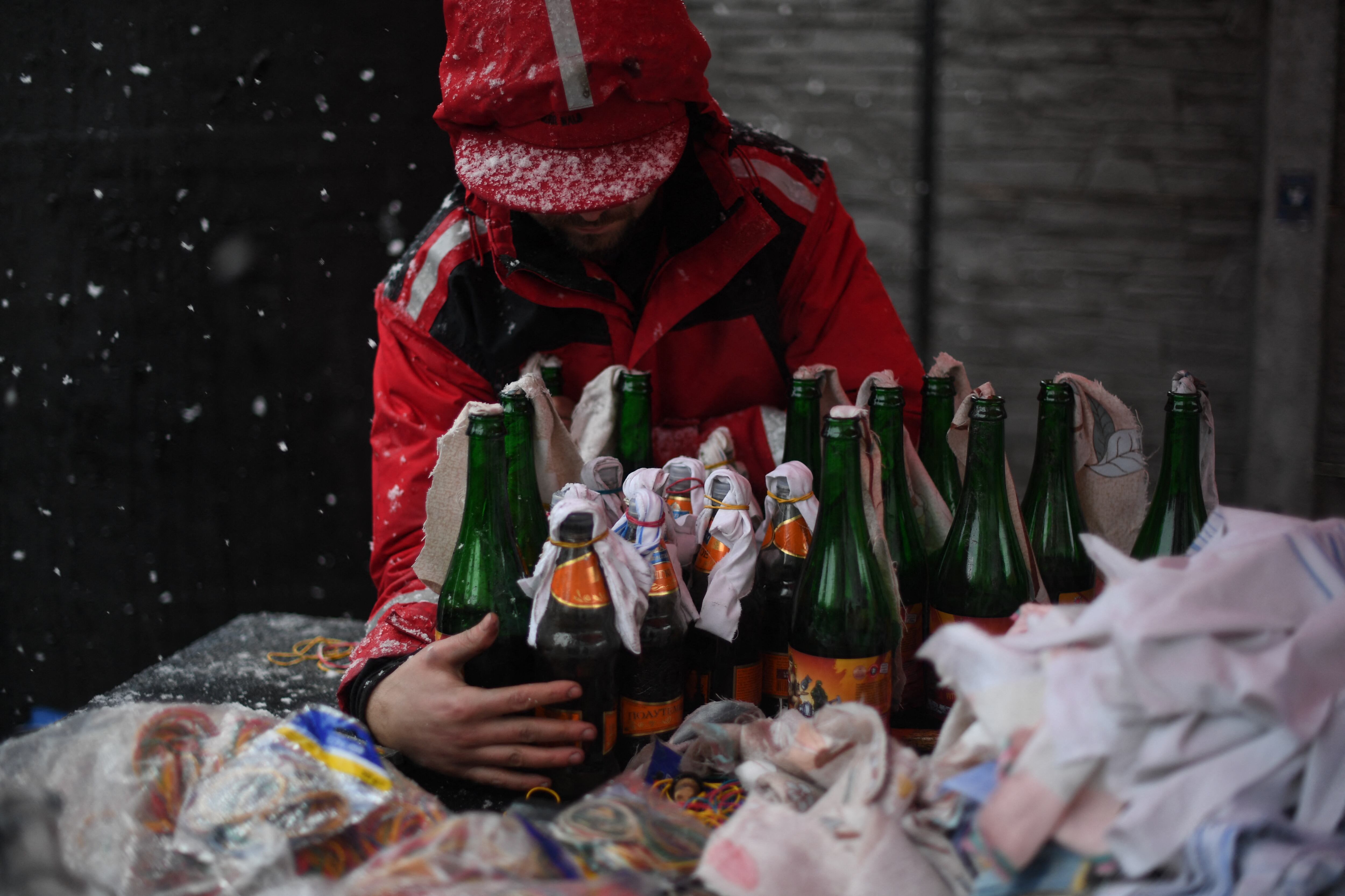 Otro equipo se encuentra hincado frente a cajas llenas de botellas de cerveza transformadas en armas. Dentro de ellas, “un tercio de diésel, dos tercios de gasolina”, una mecha de tela “¡y boom!”, dice el voluntario dedicado a la preparación de cocteles molotov.