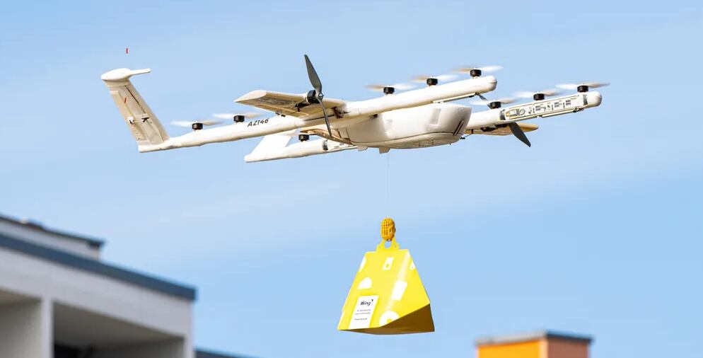 La compañía Wing (subsidiaria de Alphabet, la dueña de Google) viene invirtiendo muchísimo en drones repartidores de comida: como otras compañías, busca una alternativa aérea a la motito o la camioneta de delivery, aprovechando la enorme evolución que han tenido los cuadricópteros en los últimos años y las oportunidades que dan al no necesitar un piloto o chofer, y no estar amarrados al tráfico urbano, lo que permite un servicio con un costo más bajo y una menor demora en la entrega de productos.
