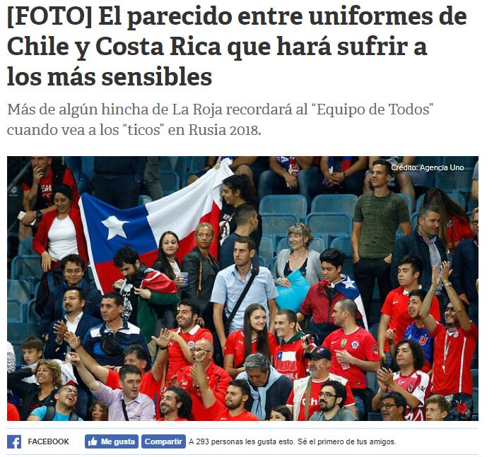 Aunque los fanáticos de este país se tendrá que conformar con seguir a otras selecciones, según el canal Teletrece, el increíble parecido entre el uniforme de los ticos con la indumentaria que utilizaba Chile antes de Brasil 2014, será como echarle sal a la herida.