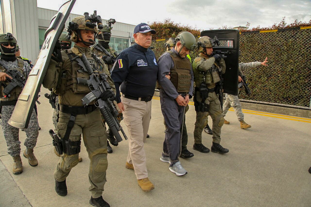 Imágenes divulgadas por la prensa local lo muestran esposado de manos y sentado en el avión. Lo acompañan policías colombianos y un funcionario de Interpol.
