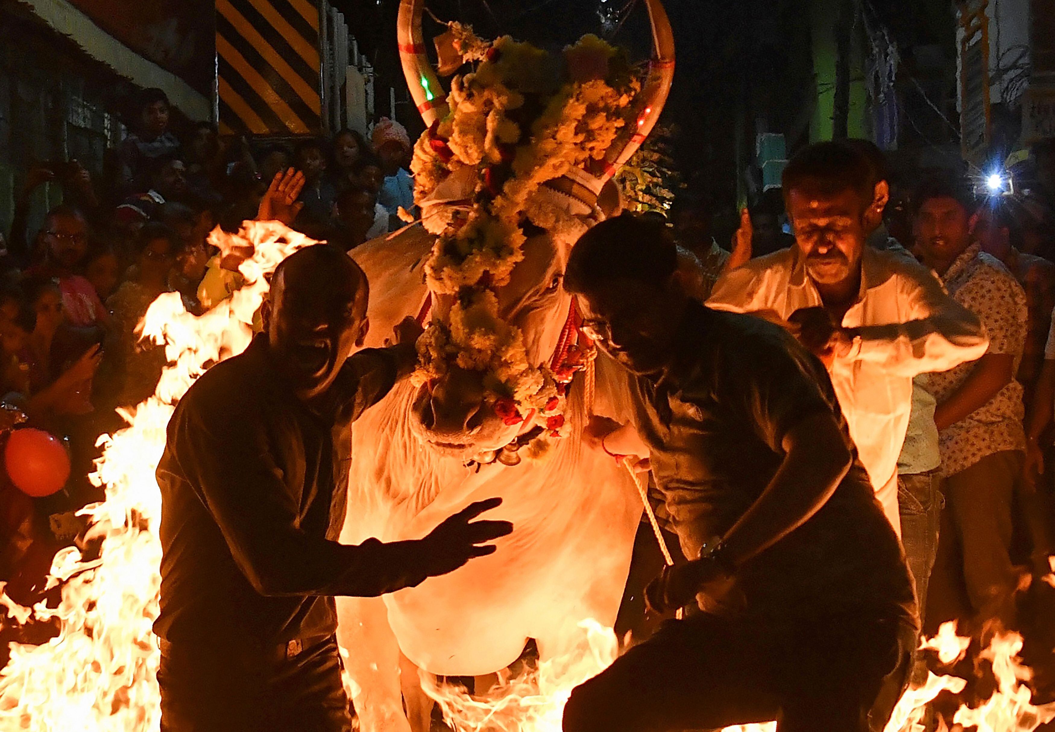En la ciudad de Bangalore, en el sur, conocida como capital india de la alta tecnología, los hombres llenan de ornamentos a sus vacas, con guirnaldas y campanas, y cruzan con ellas hileras de heno en llamas.