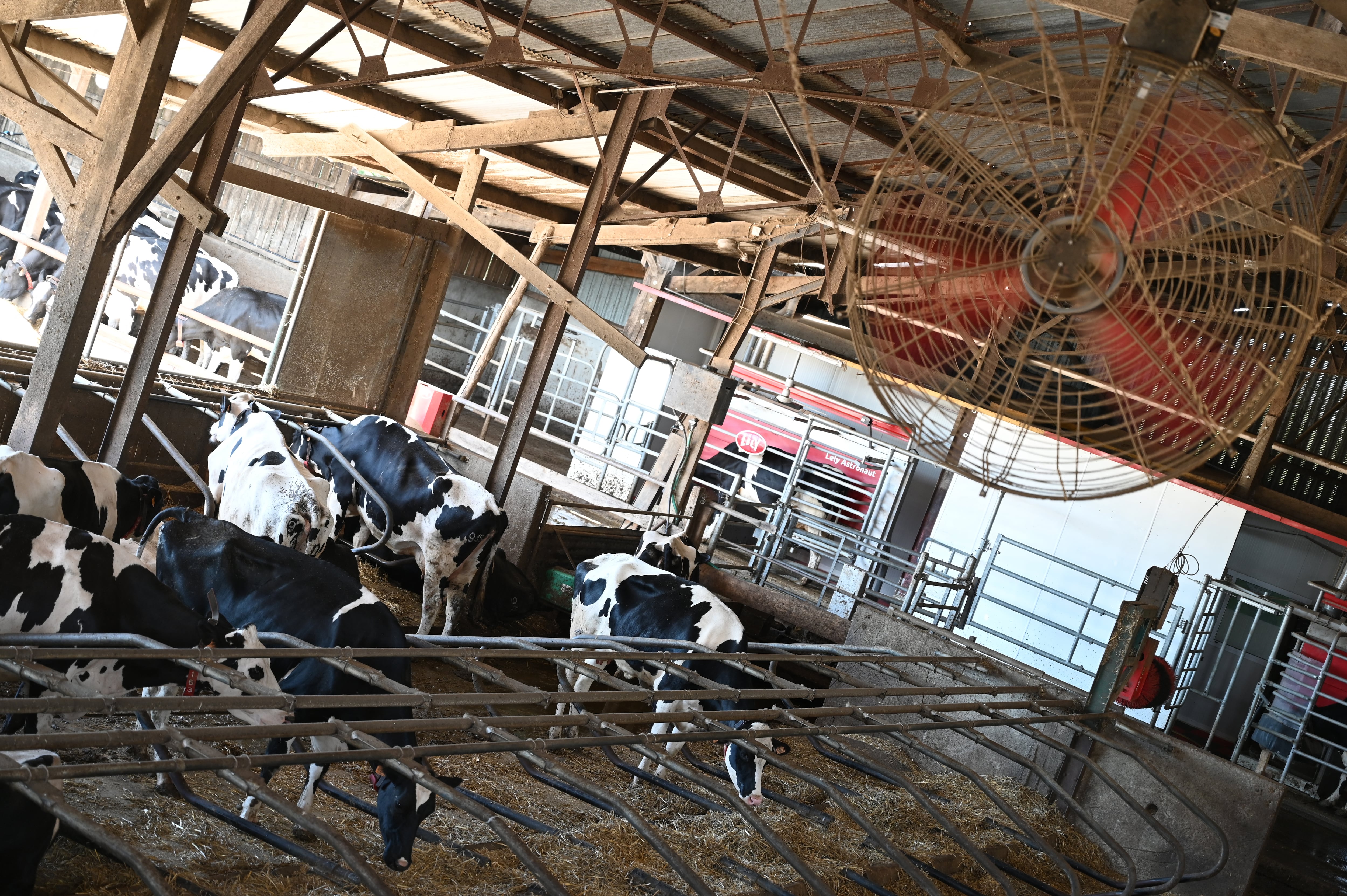 “Debido a la evolución del clima, los ganaderos se adaptan constantemente”, asegura Nicolas Joannon, dueño de la granja, explicando que cuando suben las temperaturas, el “estrés térmico” provoca que las vacas se alimenten menos y produzcan menos leche.