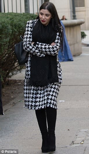 La mujer de 28 años usaba una gabardina blanca con negro, medias panty y zapatos negras, además de una bufanda Louis Vuitton en el mismo tono y un maquillaje bastante cargado.