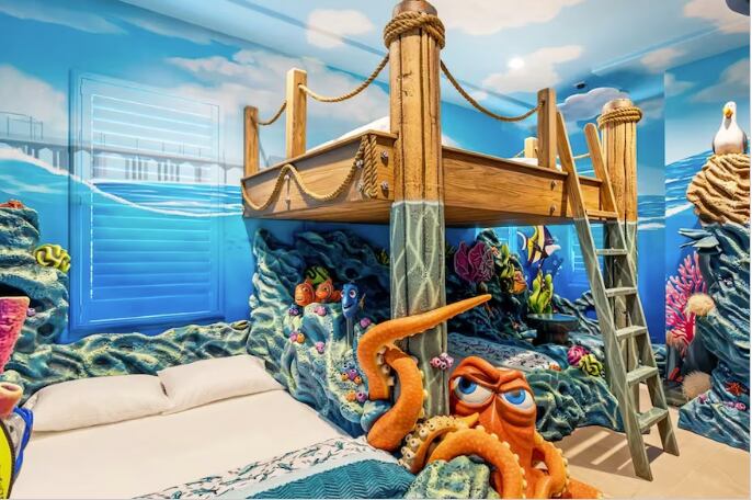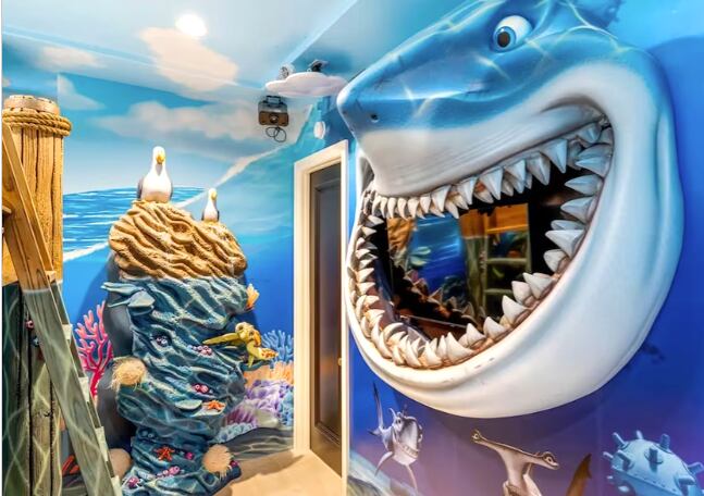 Para los fanáticos del mundo acuático, Disney estrenó en 2003 Buscando a Nemo, la historia de un pez payaso padre que cruza el océano en busca de su hijo. La historia que recaudó más de $940 millones también se encuentra presente en la mansión de Golden Oak. Un dormitorio con tres camas dobles está decorado con los peces Nemo y Mer Marlín, su amiga Dory y otros personajes de la película como el tiburón de la primera cinta y el pulpo de la segunda.