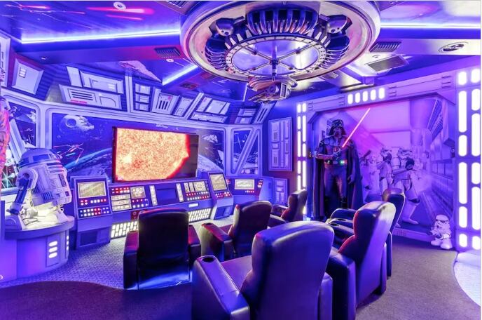 Ver una película a la noche o una serie en el tiempo libre puede ser una actividad de unión familiar. Lo que en muchas casas sucede en la sala de estar o en alguna habitación espaciosa donde haya una televisión grande, en esta mansión se viaja al espacio. Un cine completamente customizado como Star Wars tiñe de luces azuladas y violáceas las seis butacas reclinables de cuero que miran de frente a un televisor.