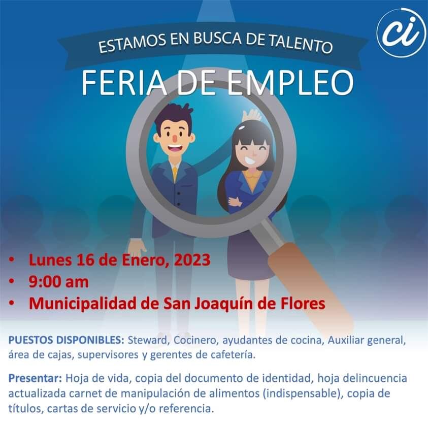 La Municipalidad de San Joaquín de Flores será la sede de una feria de empleo que tiene puestos disponibles en diversas áreas como: Steward (responsable limpieza), cocinero, ayudantes de cocina, auxiliar general, área de cajas, supervisores y gerentes de cafetería.