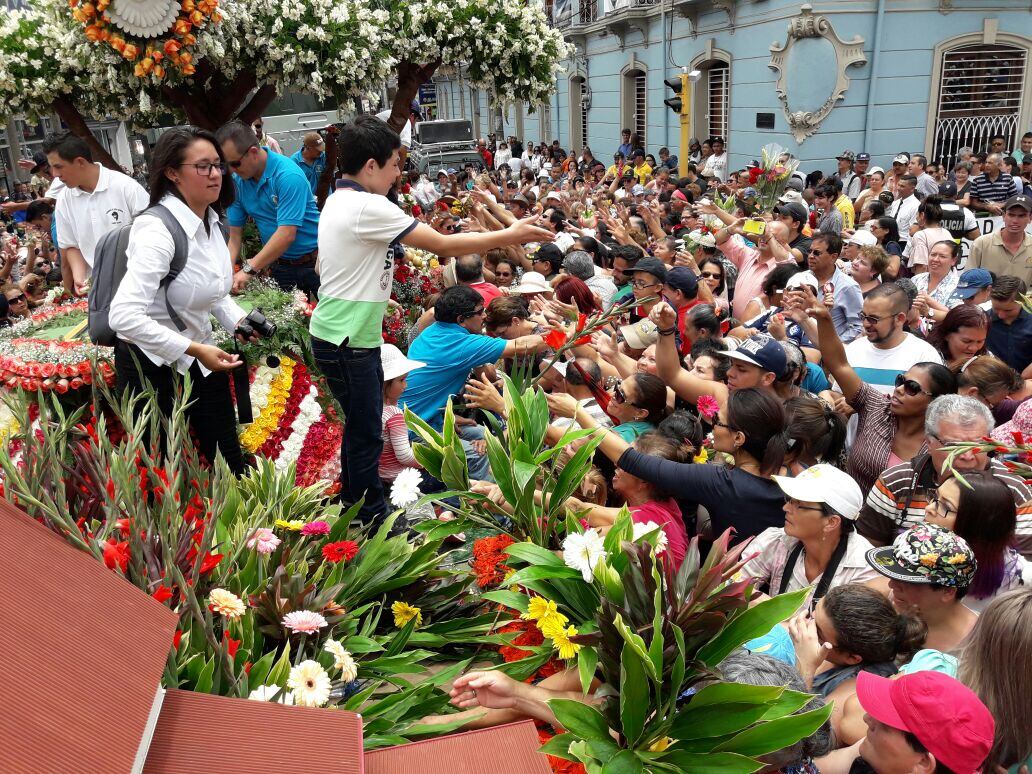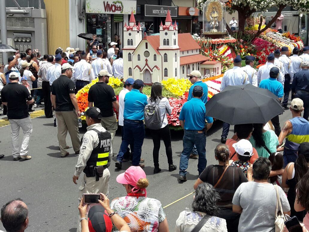 Este jueves, a las 10:55 de la mañana, se colocó la imagen de La Negrita en la carroza que la trasladó a la Catedral, una carroza adornada por más de 40 mil flores y fresas gigantes, entre otras frutas, donadas por agricultor es de Llano Grande de Cartago.