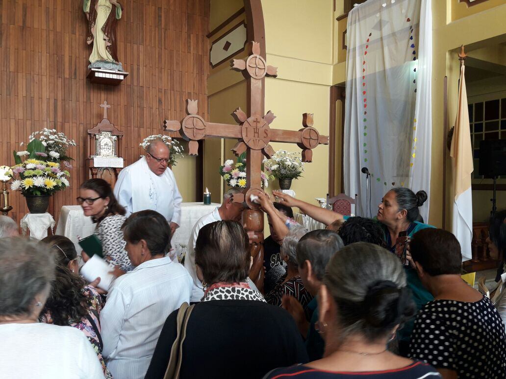 Una cruz de madera que mide 2,45 metros de alto y 1,30 de ancho, tiene incrustado en un relicario un mechón del cabello de la beata que fue bendecida por el propio papa Francisco y ya luce un poco desgastada por su largo peregrinar por 250 parroquias de Centroamérica.