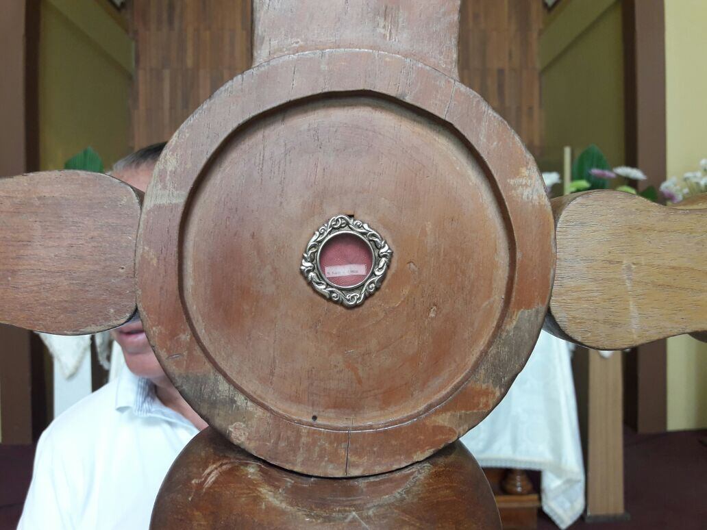 La cruz original hecha en piedra y ubicada en la plaza de San Francisco Javier, en Chiquitos, Paraguay, fue la que artesanos bolivianos tomaron de modelo para hacer la de madera con la reliquia de Nazaria Ignacia.
