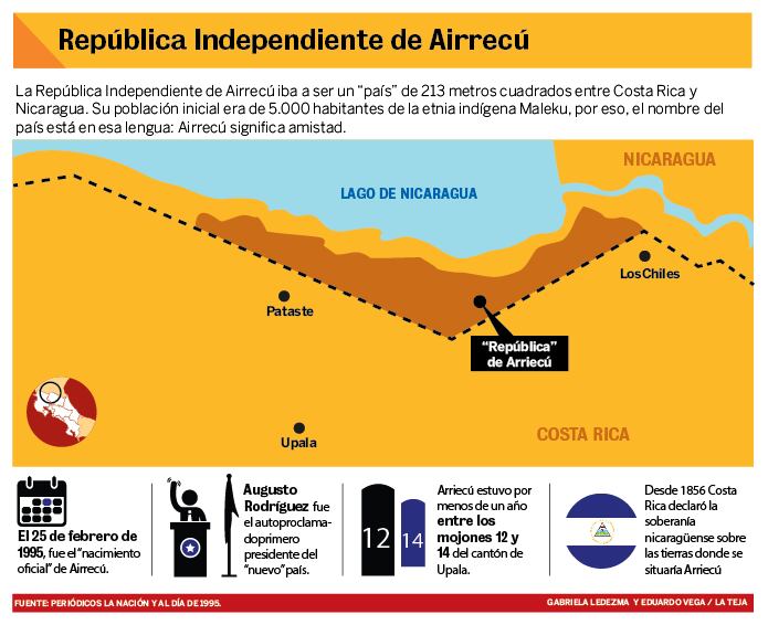 Esos dos casos independentistas del 2017, tienen un hermano mayor en Tiquicia. El 25 de febrero de 1995 “nació oficialmente” la República Independiente de Airrecú, que fue nada más y nada menos que el intento independentista de un grupo de ticos que lucharon porque entre Costa Rica y Nicaragua “naciera” un nuevo país, justo como lo intenta Cataluña y con las mismas ilusiones de ser independientes de Asgardia.