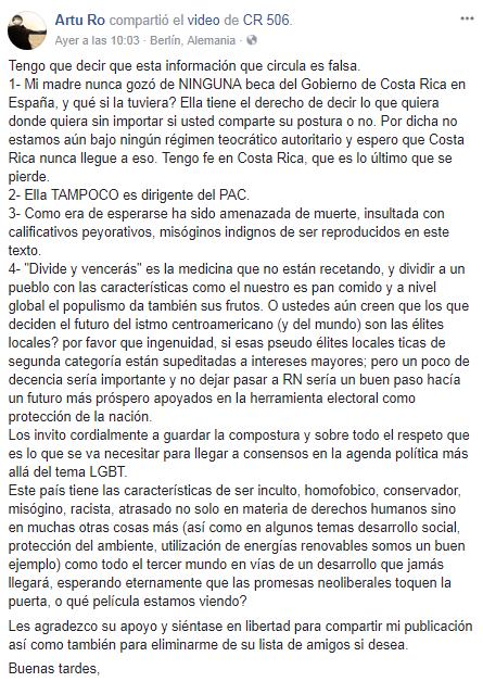 "Mi madre nunca gozó de ninguna beca del Gobierno de Costa Rica en España, y qué si la tuviera? Ella tiene el derecho de decir lo que quiera, donde quiera, sin importar si usted comparte su postura o no. Por dicha no estamos aún bajo ningún régimen teocrático autoritario y espero que Costa Rica nunca llegue a eso. Tengo fe en Costa Rica, que es lo último que se pierde. Ella tampoco es dirigente del PAC", escribió el joven en Facebook. El mensaje fue compartido por Ana Marcela.