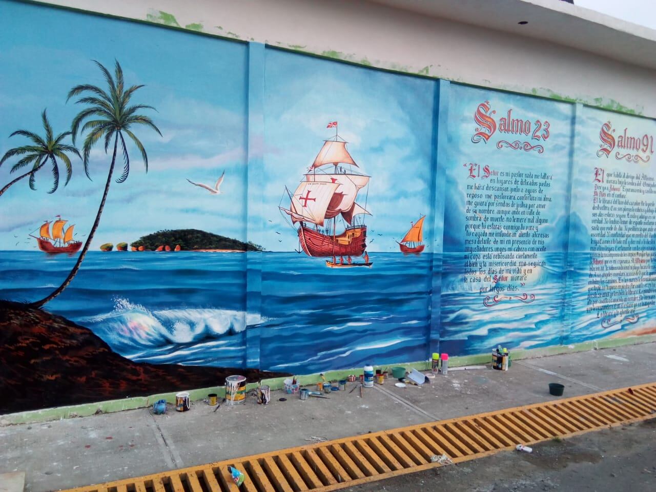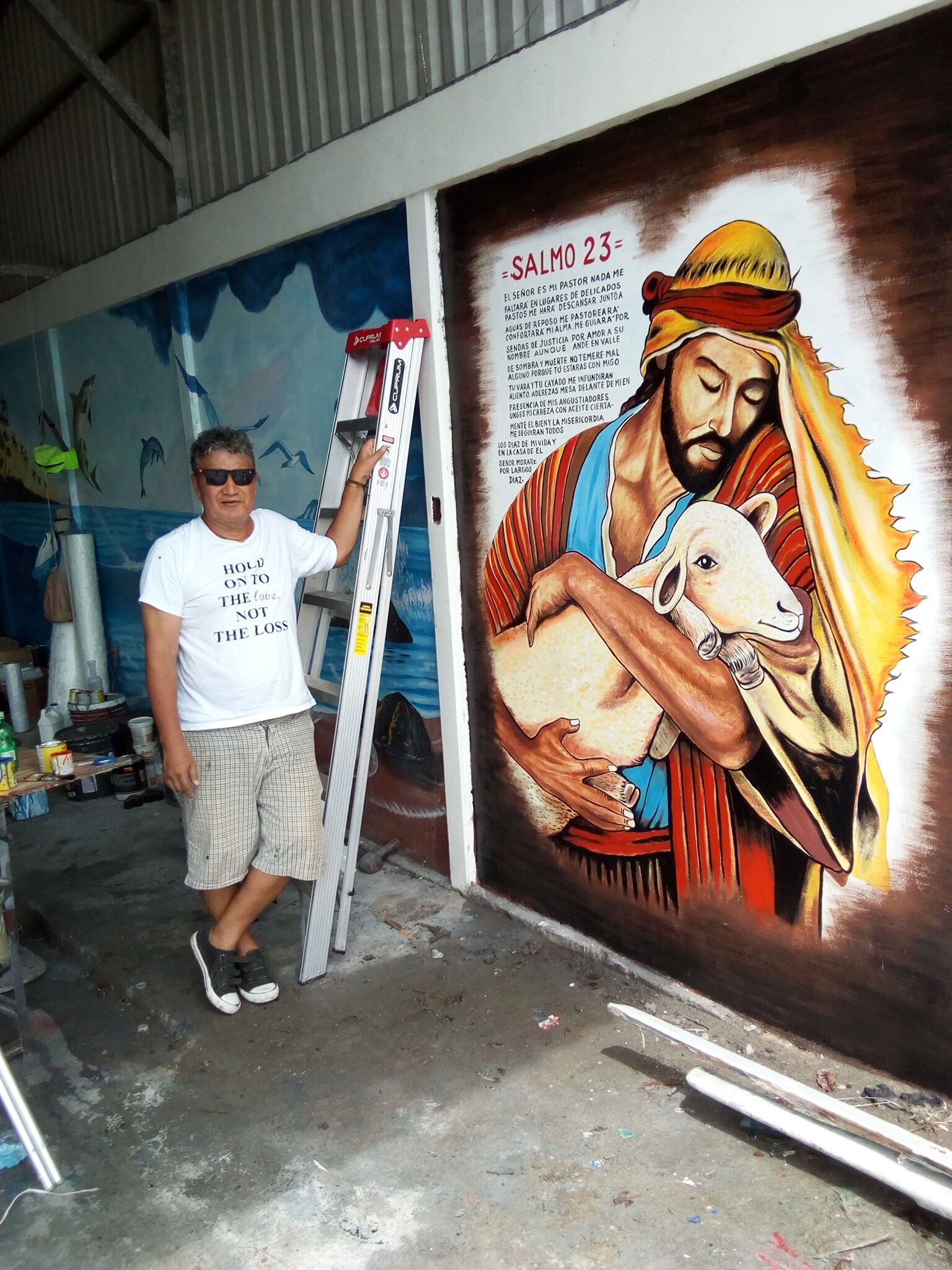 Lo hizo con un bonito mural que está en la escuela Atilia Mata, ubicada en barrio San Juan, 100 metros al norte del Ebáis de Los Cocos de Limón. Está inspirado en la famosa obra La creación de Adán, de Miguel Ángel.