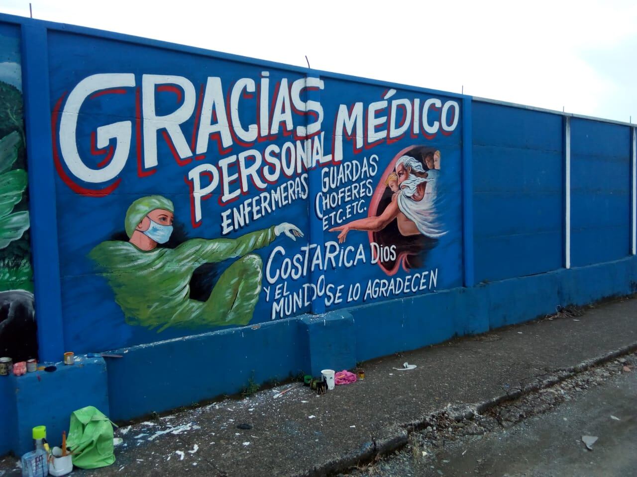 “Gracias personal médico, enfermeras, guardas, choferes, etc... Costa Rica, Dios y el mundo se lo agradecen”, es el texto que acompaña la imagen de 2,30 metros de alto por 4 metros de largo, el cual tardó tres días pintándolo.