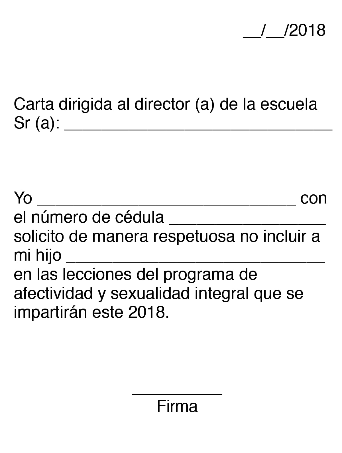 “Yo ‘fulano de tal’ con el número de cédula tal, le solicito de manera respetuosa no incluir a mi hijo ‘zutano de tal’ en las lecciones del programa de afectividad y sexualidad integral”. (Ver machote).