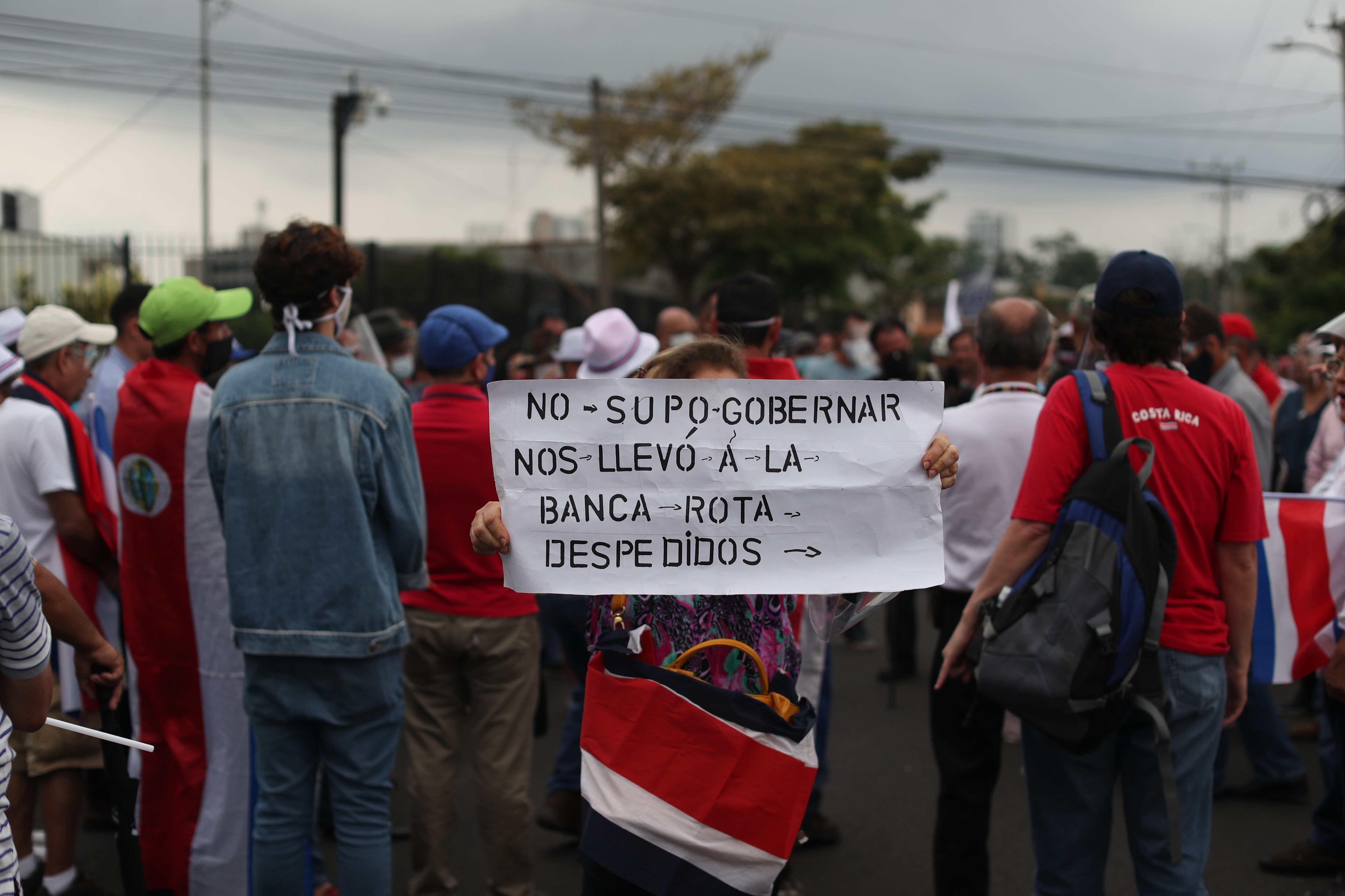 Por primera vez en cinco meses, ese martes la pareja logró hacer platica vendiendo banderas en medio de la protesta. Frente a Casa Presidencial, en Zapote, nos encontramos a Heriberto Chaves, quien andaba empunchado ofreciendo banderas de Costa Rica.