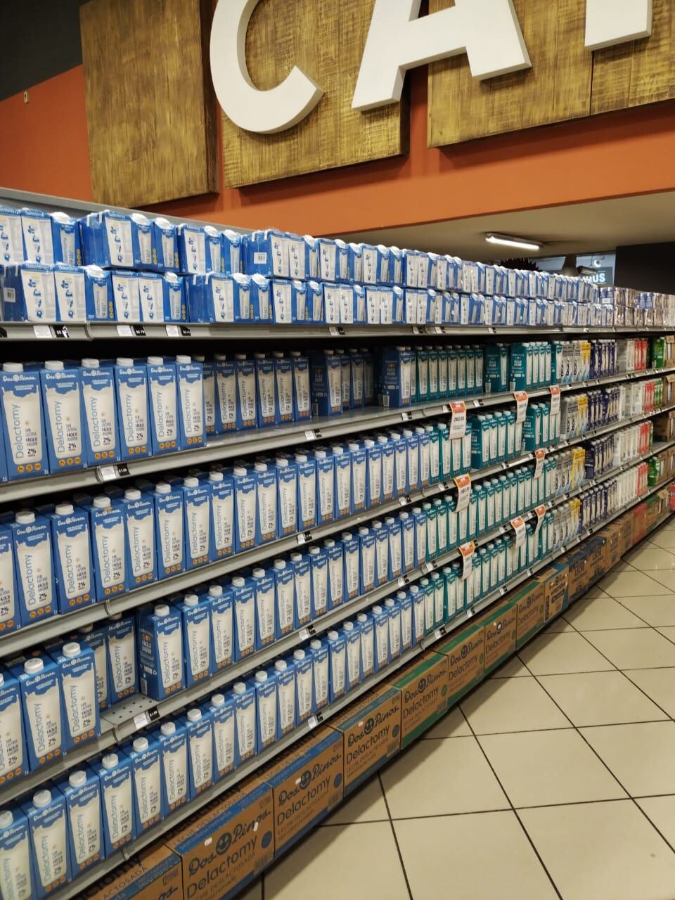Por ejemplo, nos sorprendimos que en el pasillo de la leche en caja que no es refrigerada y en polvo, medio pasillo al menos era ocupado por una marca nacional. Las bolsas de leche Pinito se veían en todos tamaños y ofertas. Estaba a dos bolsas de 350 gramos por $7 (unos ¢3.800).