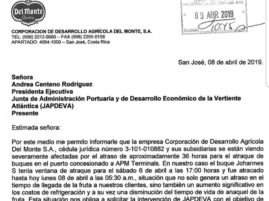 Así lo hizo ver José Alberto Peláez, representante de la Corporación de Desarrollo Agrícola Del Monte, mediante una carta enviada a la presidenta de Japdeva, Andrea Centeno, a la que le pide solucionar lo antes posible los atrasos en la nueva terminal de contenedores.