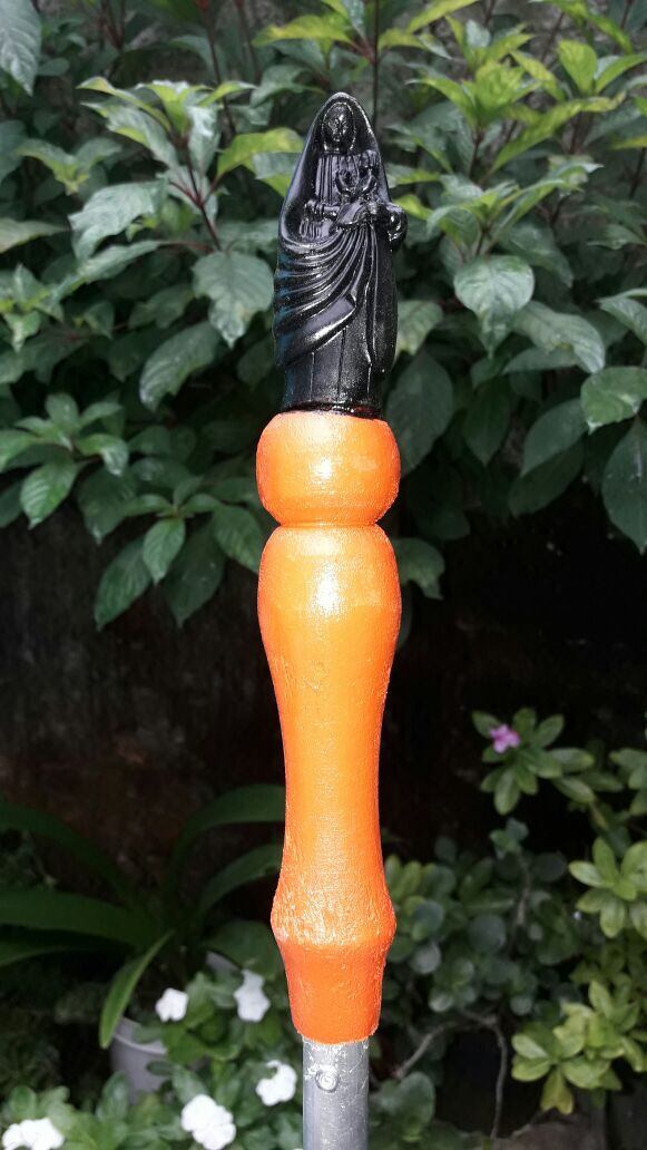Los bastoncitos son lo suficientemente resistentes para que los romeros tengan un buen soporte en la caminata y en la parte de arriba tienen una imagen de la Negrita. Todo lo hace él.
