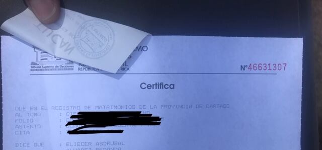 Ya con la ley de su lado, este cartago preparó todos los documentos y le dio bimba al matrimonio. Se consiguió dos testigos, el apoderado y listo. Un “hermano en la fe” de este tico se prestó para ser ese apoderado y firmar en nombre de su amada.