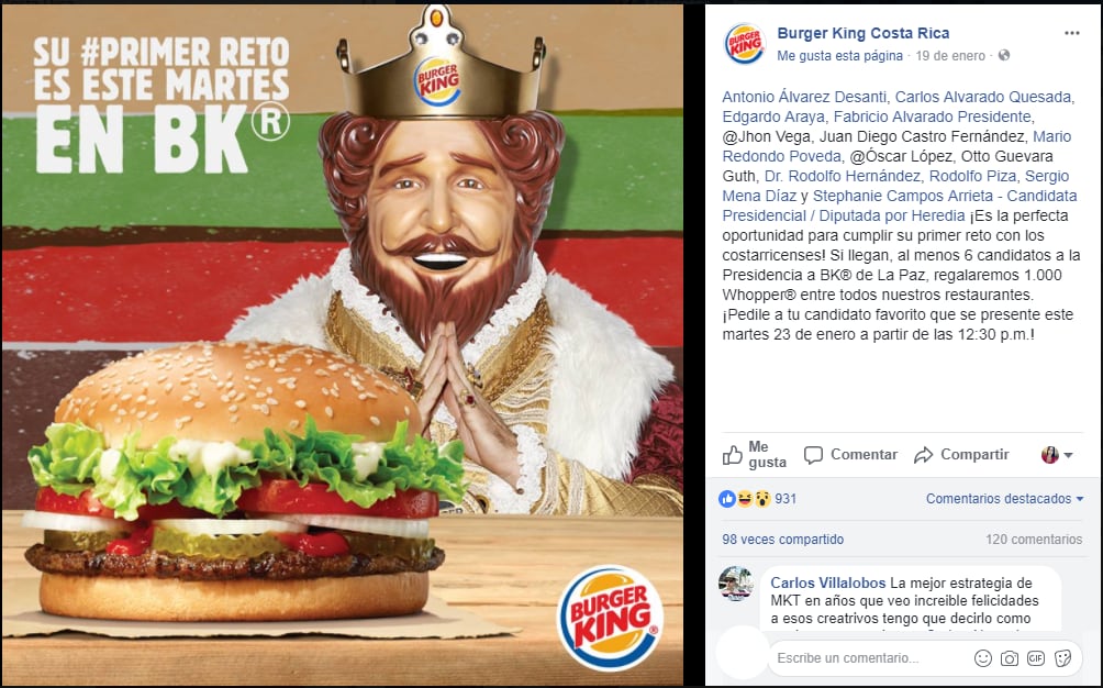 “Con tal de que les regalen whooper a los costarricenses yo haré acto de presencia”, escribió el diputado y también postulante por el Partido Accesibilidad Sin Exclusión en la imagen que el restaurante publicó.