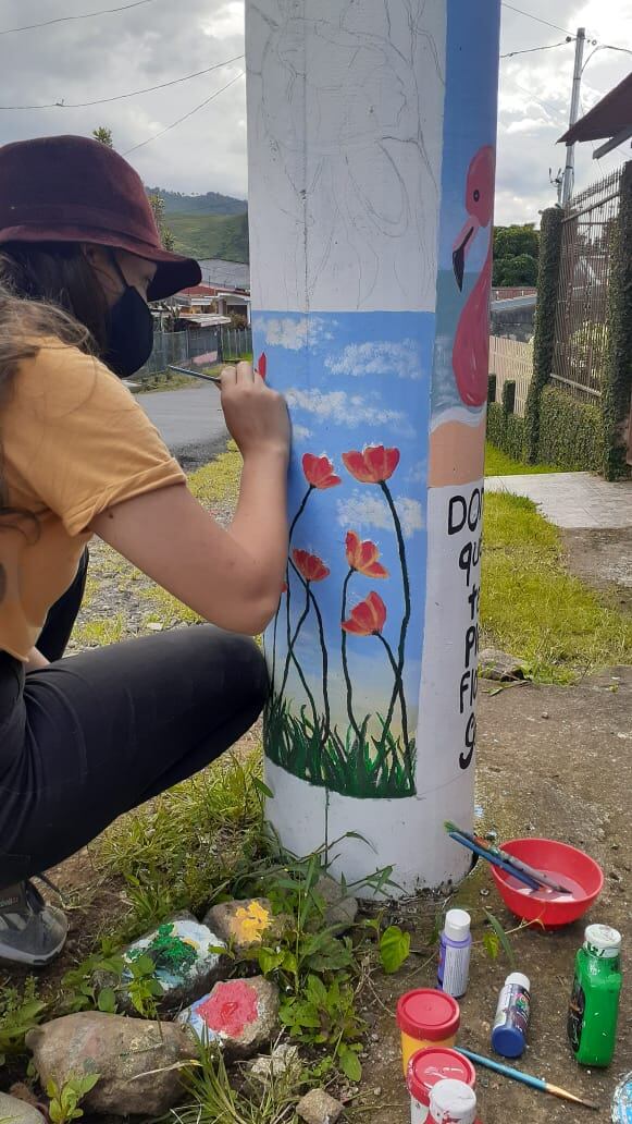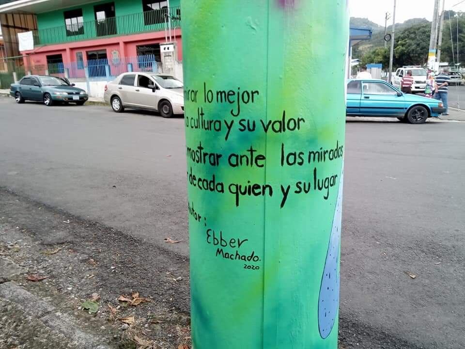 La también artista gestionó los permisos con el Instituto Costarricense de Electricidad (ICE) para decorar, con el talento de jóvenes artistas locales, los postes del alumbrado público, así como la pared de la delegación de la Policía local que sirvió además de ejemplo para demostrar que no todos los grafitis son malos.