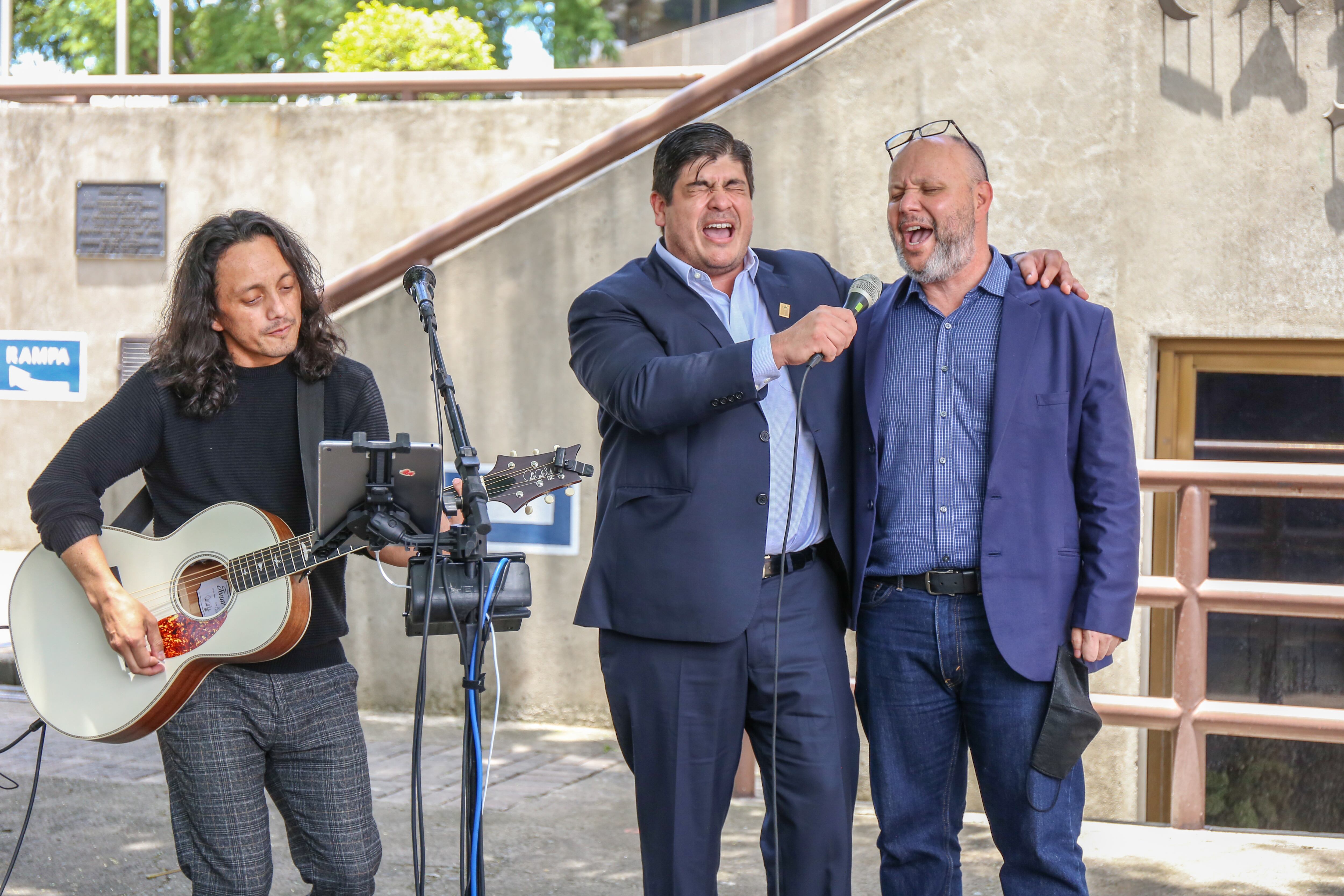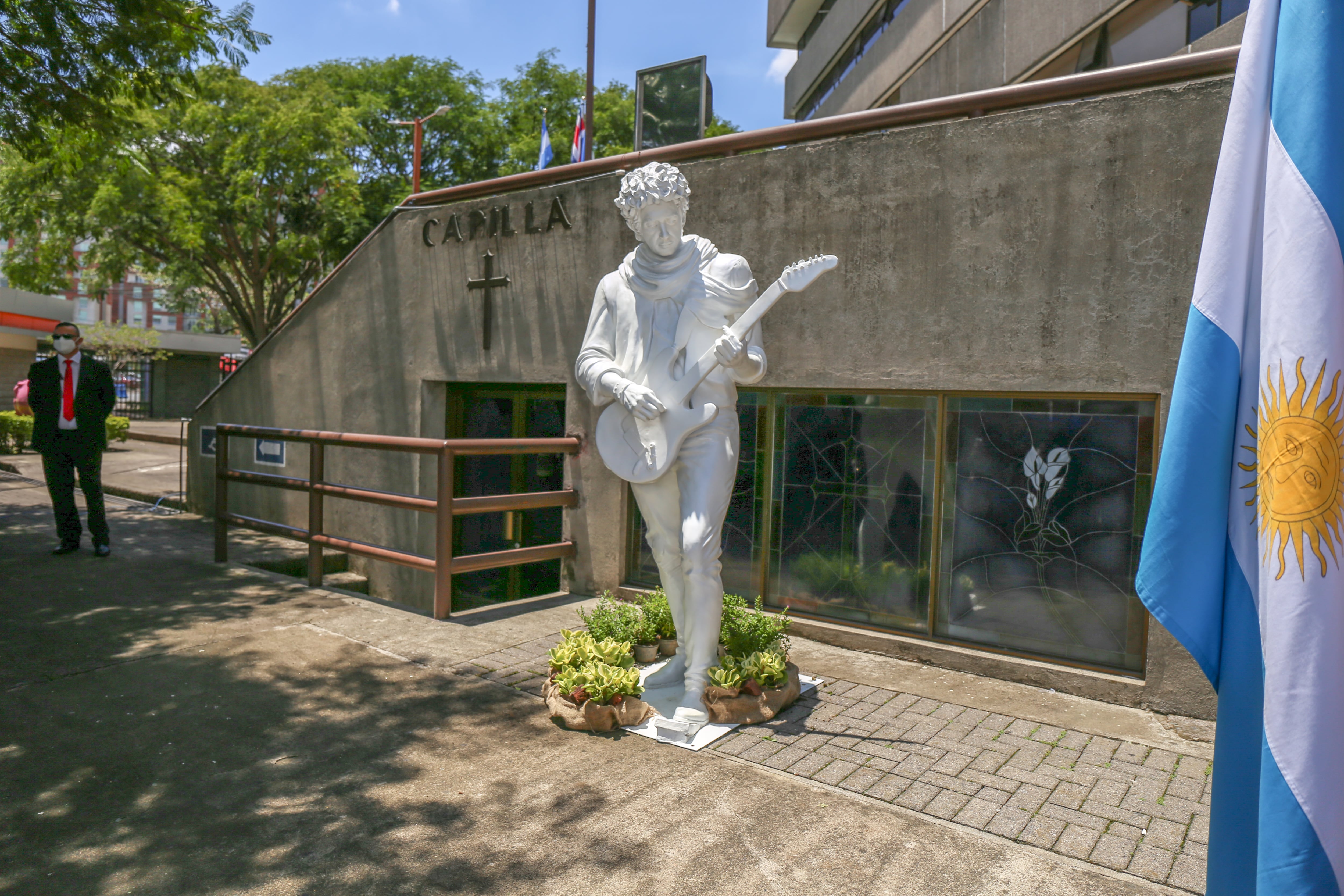 Alvarado cantó a todo galillo dos canciones de la banda argentina Soda Stereo, este sábado, después de la develación de la escultura de Gustavo Cerati en el edificio de la Municipalidad de San José.