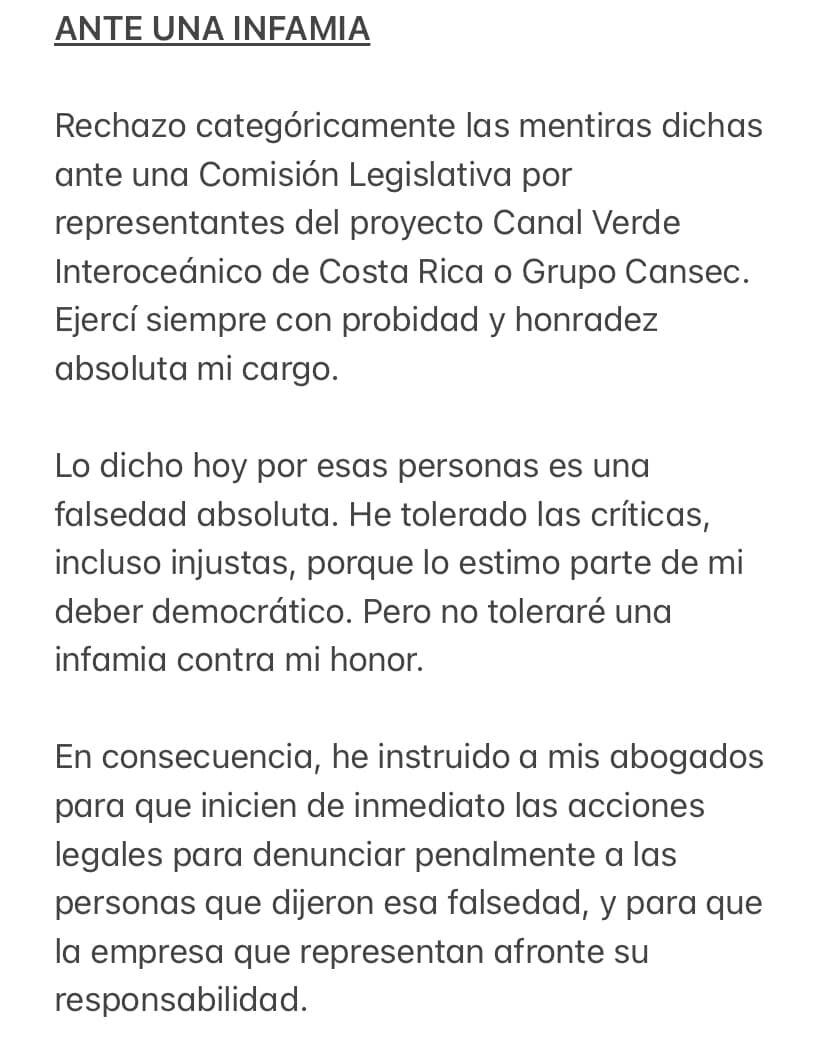 “Rechazo categóricamente las mentiras dichas ante una Comisión Legislativa por representantes del proyecto Canal Verde Interoceánico de Costa Rica o Grupo Cansec”