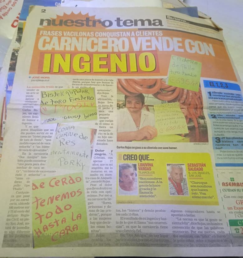 Es así que en su carnicería se conseguía costilla de cerdo besador; bistec de vaca virgen, posta de cerdo con sueño, bistec suave de vaca feliz, posta para desmechar de todo sexy, trocitos de vaca deportista, costilla de vaca voladora y chorizo casi de Puriscal, entre otros antojos.